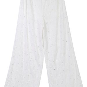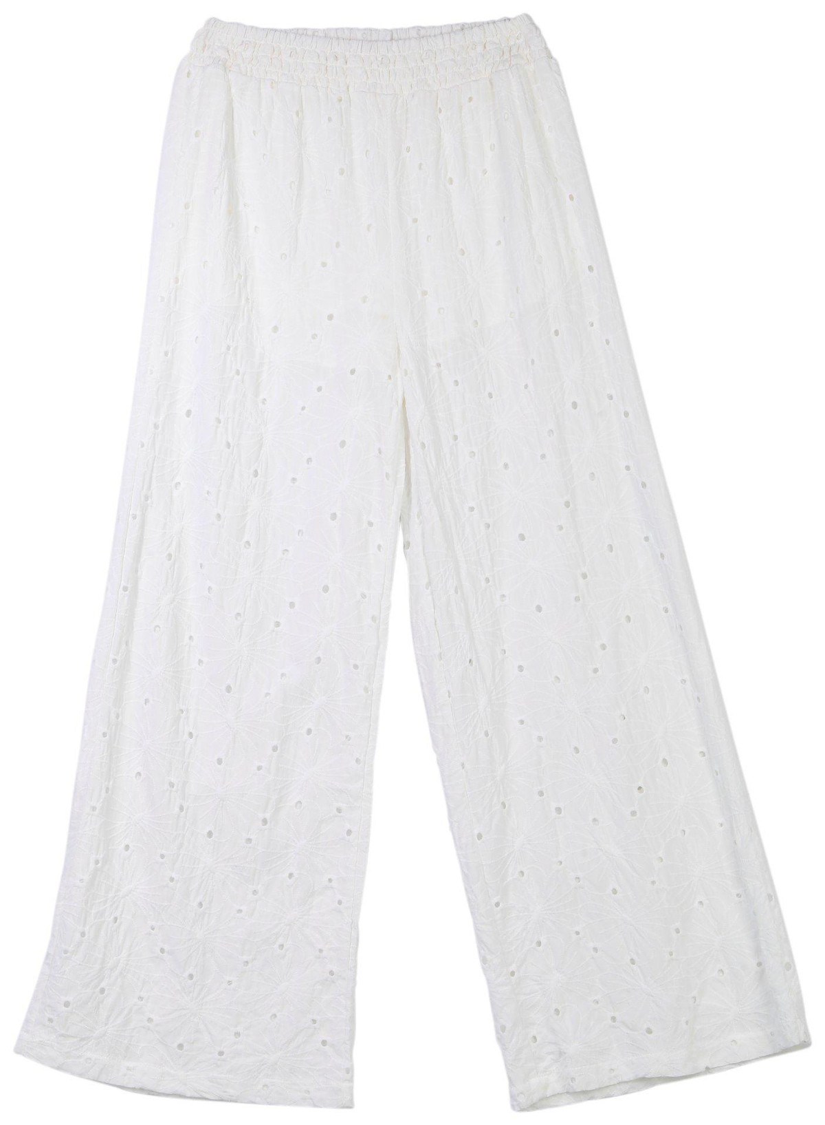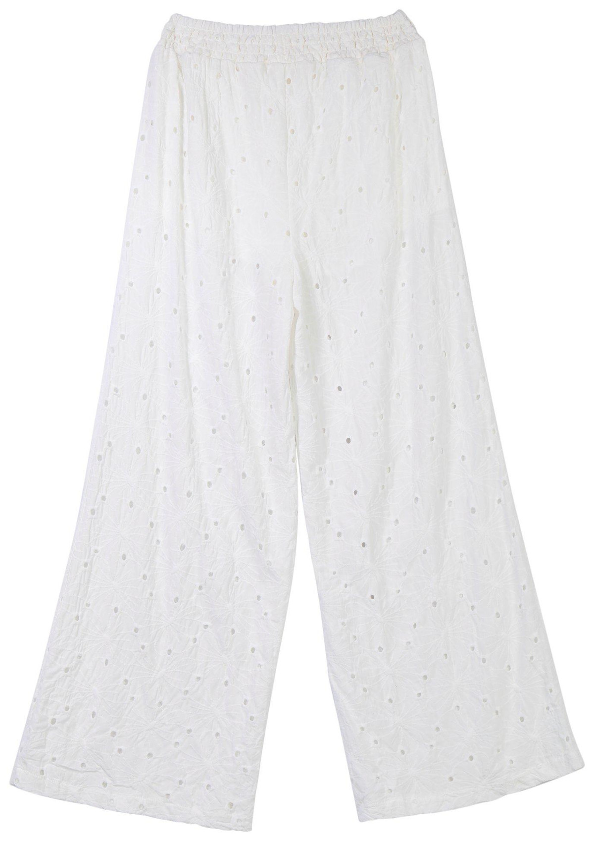 Step into effortless elegance with the Juniors Floral Eyelet Wide Leg Pants. Featuring a solid color with delicate floral eyelet detailing, a comfy elastic waistband, and a breezy wide leg fit, these pants blend charm and comfort for a fresh, feminine look. Fabrication 100% rayon