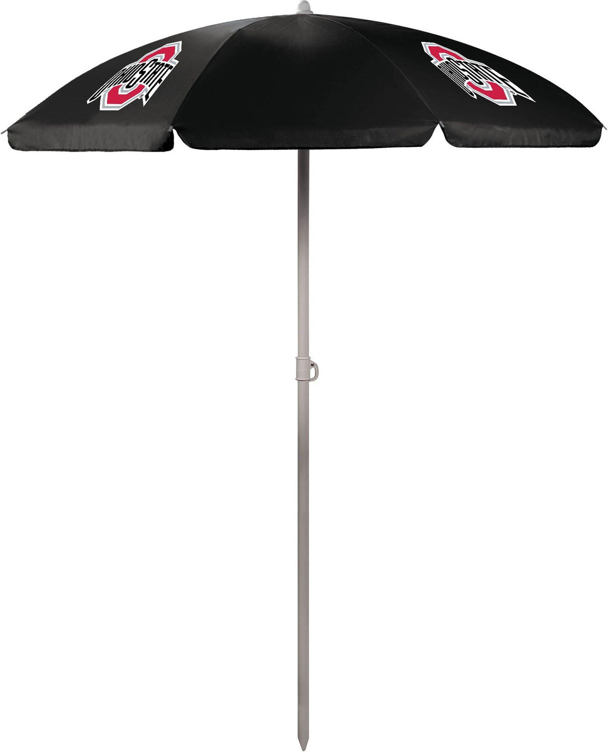 This umbrella is perfect for the beach, tailgating, or picnics. The pole measures 81.5” tall and 1.25” diameter with a tilting option as well as pointed end for easier penetration into the ground. Umbrella measures 5.5′ across. Sturdy drawstring bag with strap included.