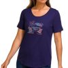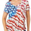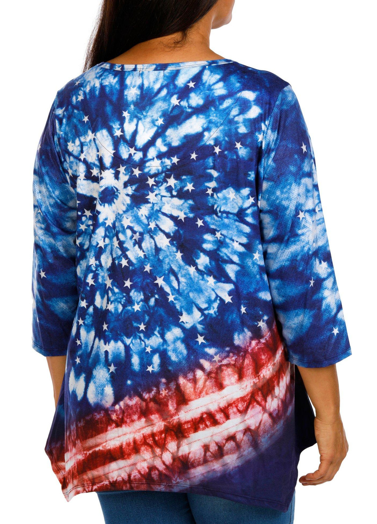 Celebrate in style with this plus size top featuring an American flag inspired tie dye design. Sparkling rhinestone embellishments add a festive touch while the v neckline and three quarter sleeves offer a flattering and comfortable fit. Fabrication 95% polyester, 5% spandex