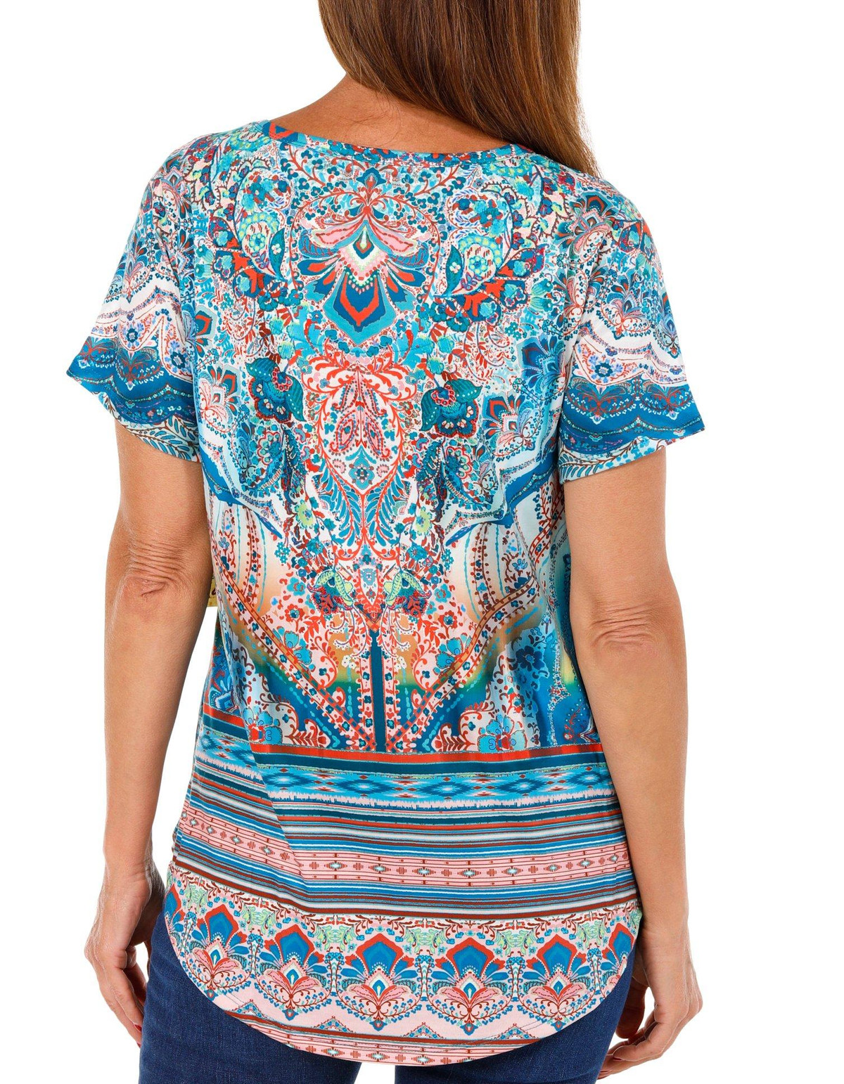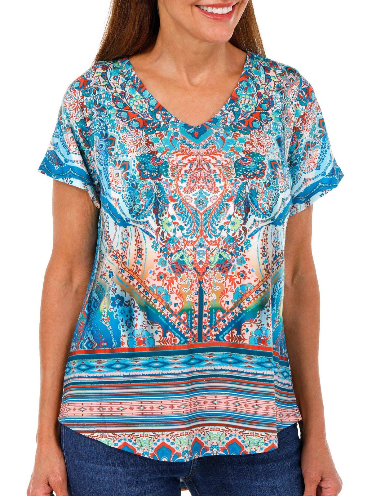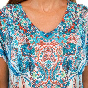 This women’s boho floral top features a vibrant multicolored print with a flattering v neckline and short sleeves. Rhinestone accents add a touch of sparkle making it a stylish choice for both casual and dressy occasions. Fabrication 95% polyester, 5% spandex