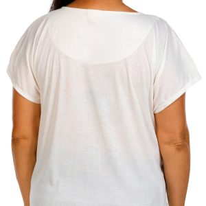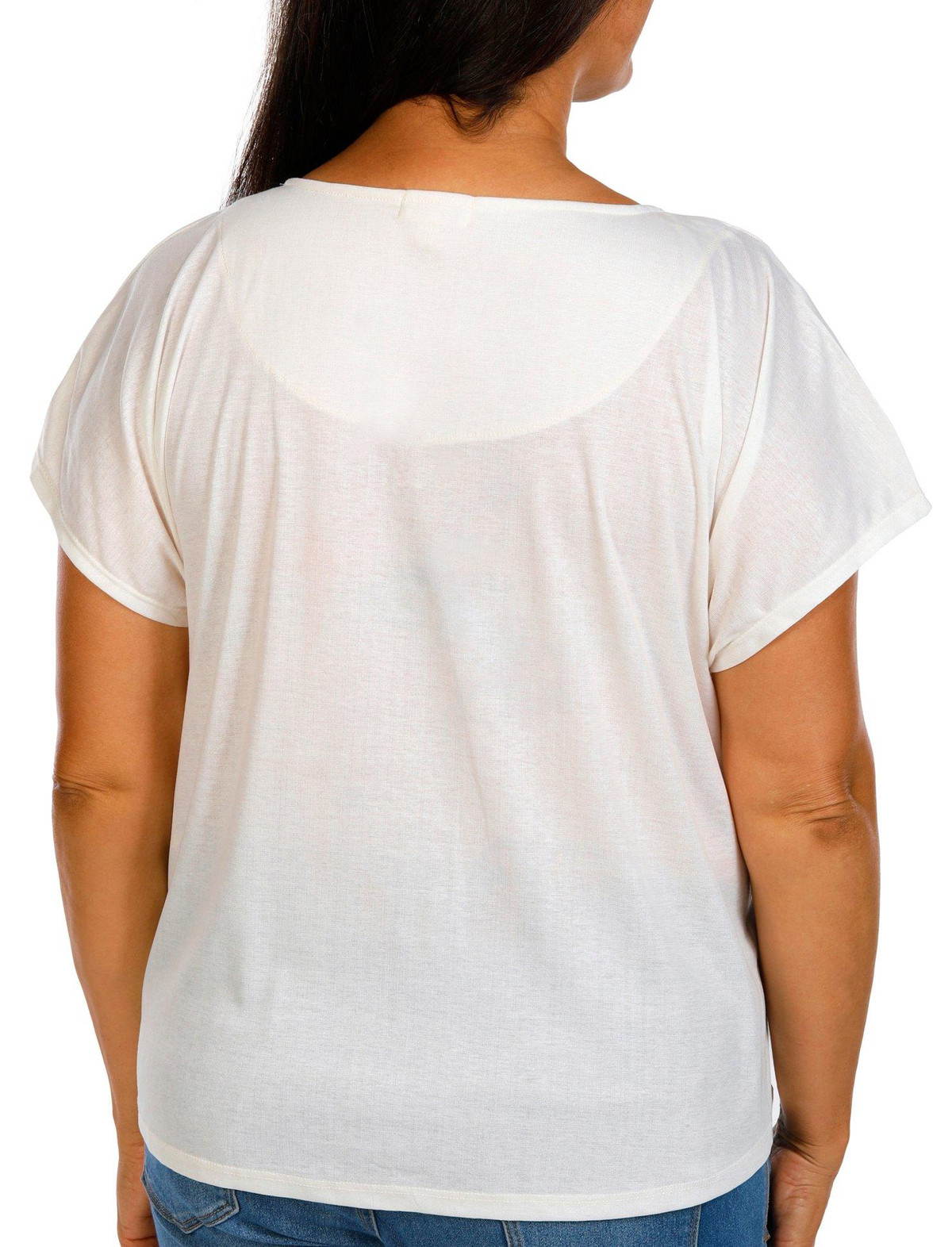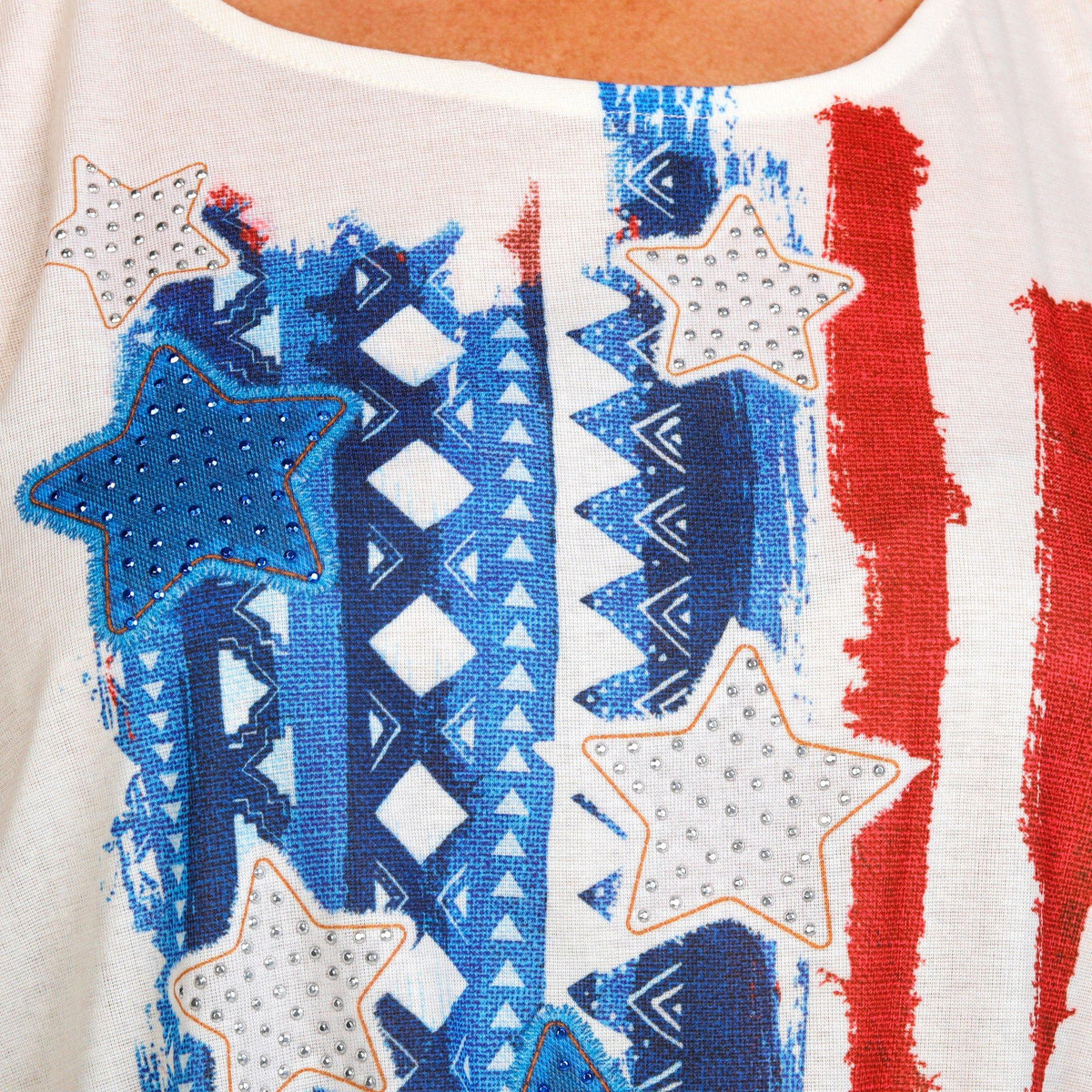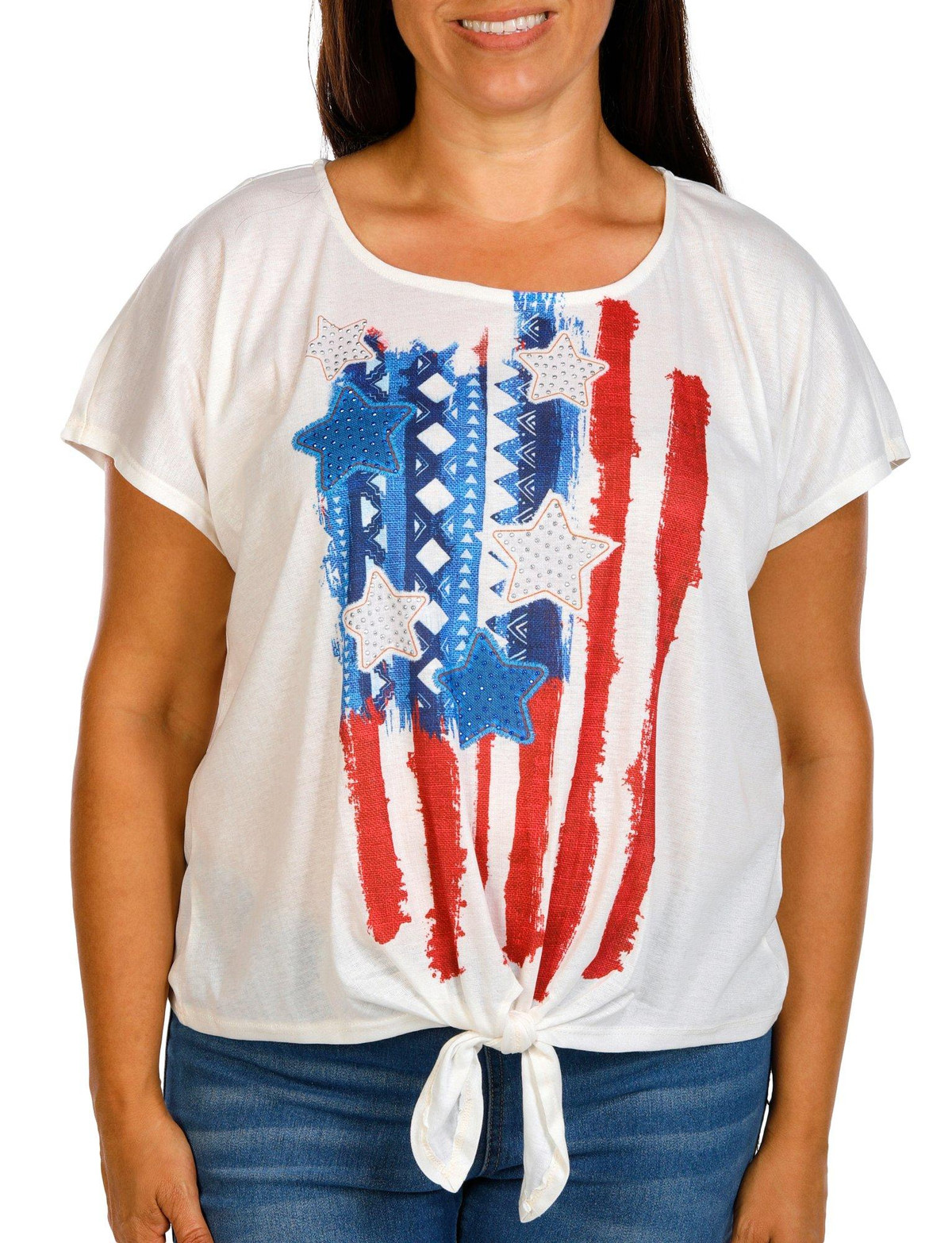 This short sleeve top features an Americana inspired print on lightweight knit fabric, round neckline, stud embellishments, a hi-low hem, and relaxed styling. Fabrication made from 100% polyester