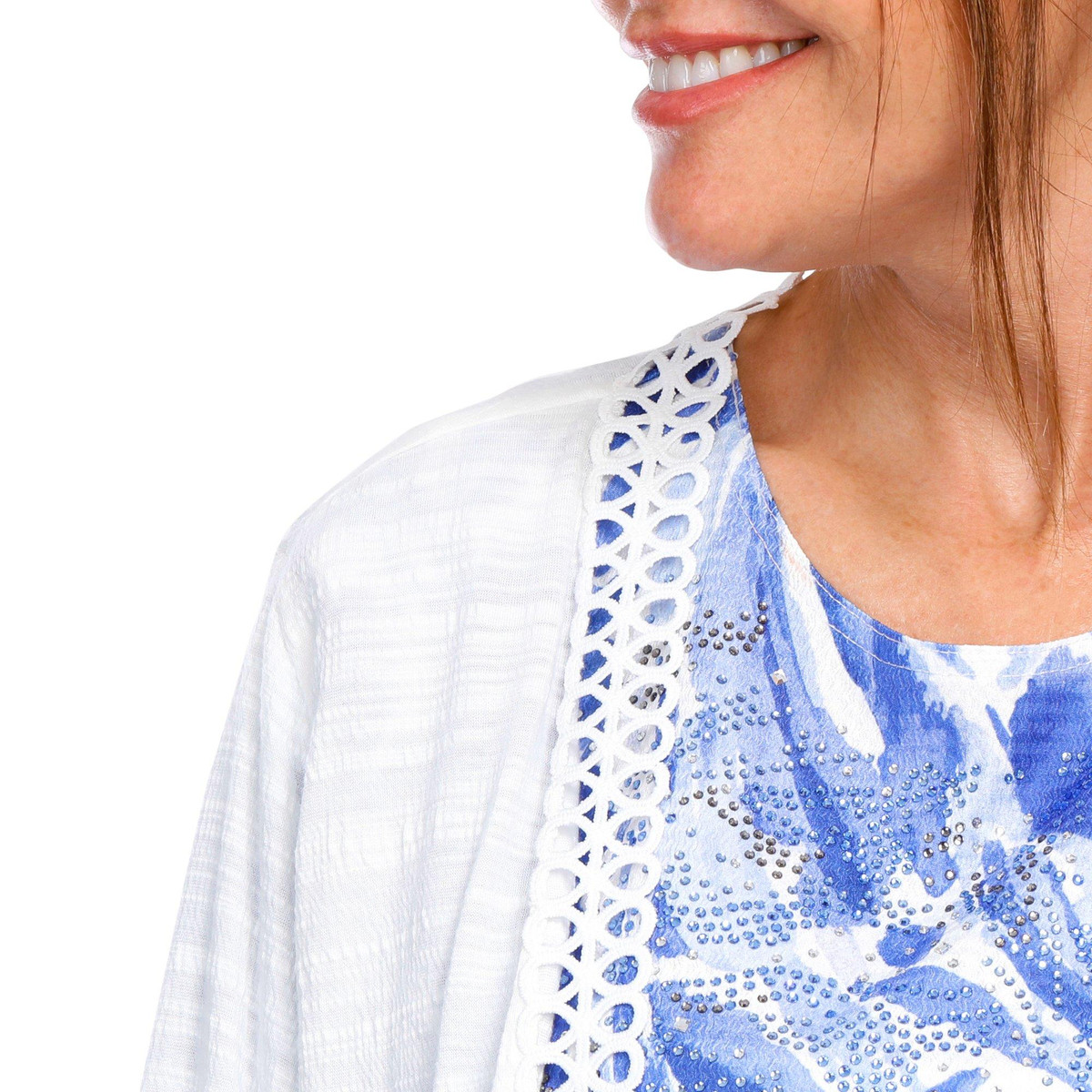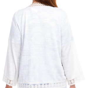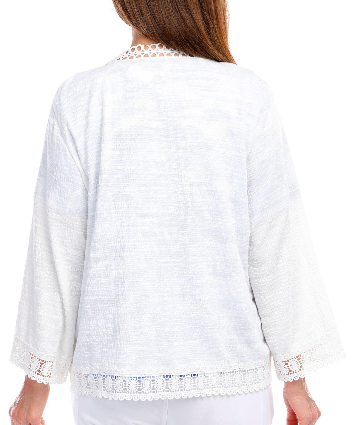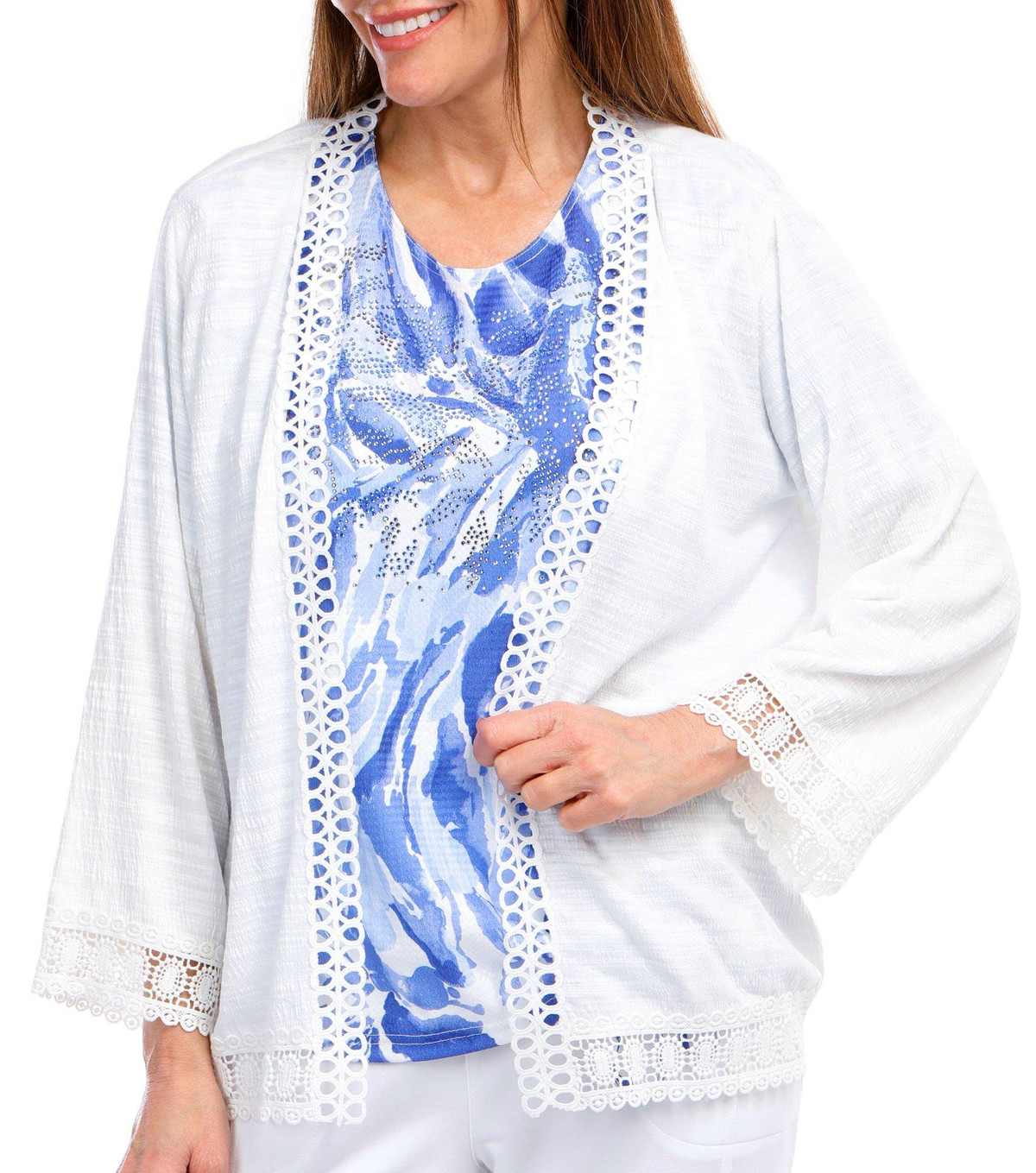 Wrap yourself in elegance with this Long Sleeve Lace Trim Cardigan. Featuring a delicate lace trim and an open front design, this cardigan adds a touch of sophistication to any outfit. Crafted from soft, comfortable fabric, it ensures all-day comfort while providing a stylish layer. Perfect for both casual and dressy occasions, this versatile piece pairs effortlessly with dresses, jeans, or skirts. Fabrication is 71% polyester, 28% rayon, 1% spandex.