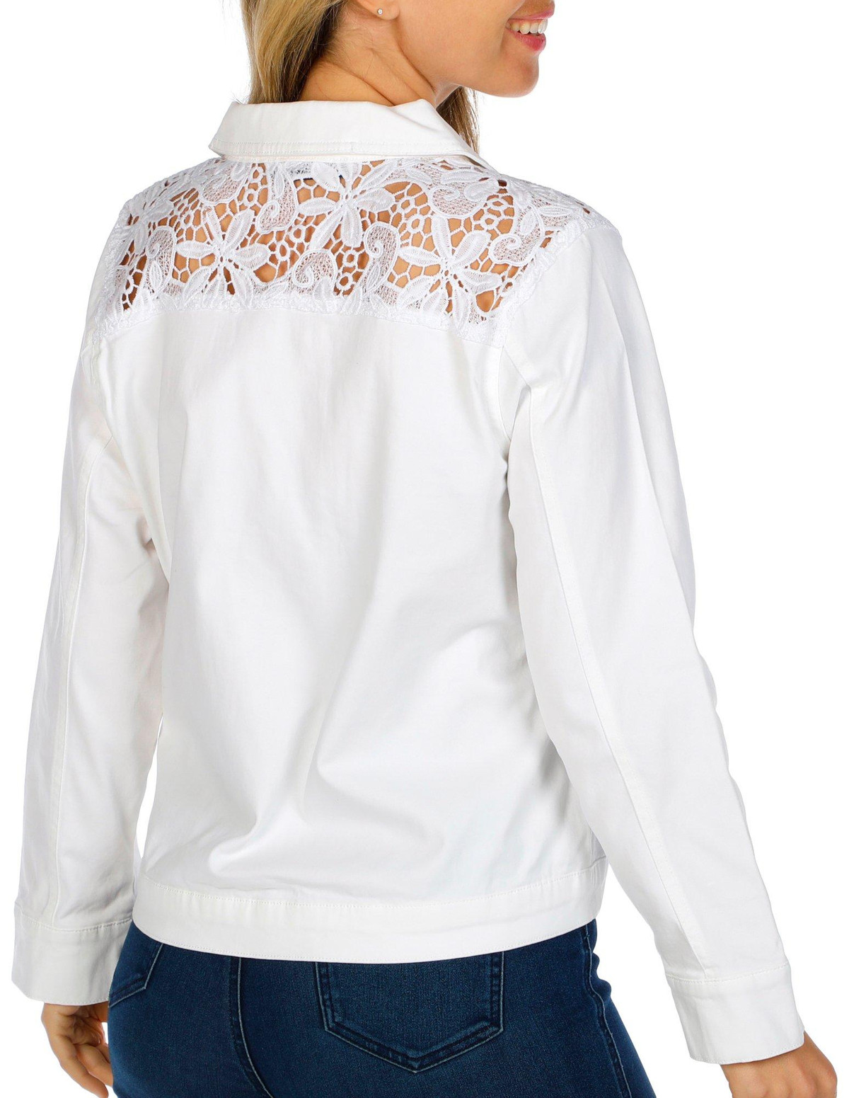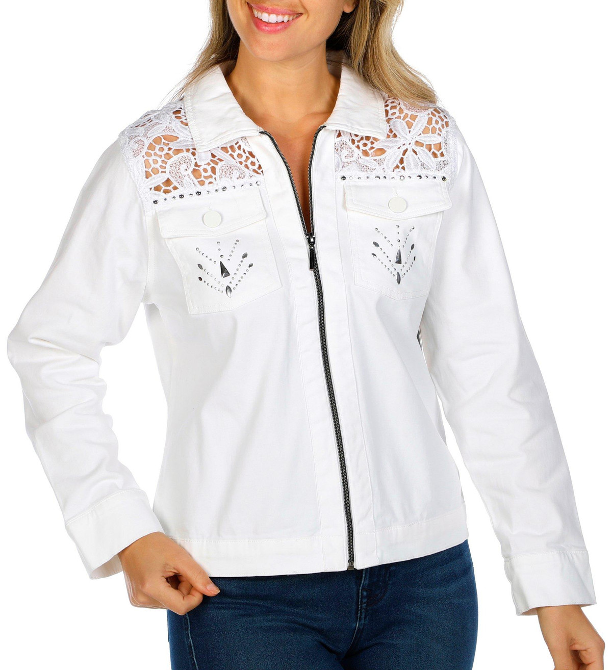 Step up your outerwear with this womens lace zipper jacket. Designed in a solid color with a front zipper closure, it features chest pockets accented with stud embellishments and a delicate lace section on the shoulders for a feminine touch. Fabrication 97% cotton, 3% spandex.