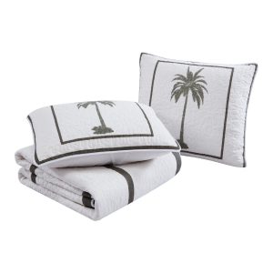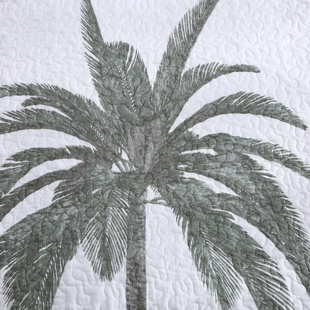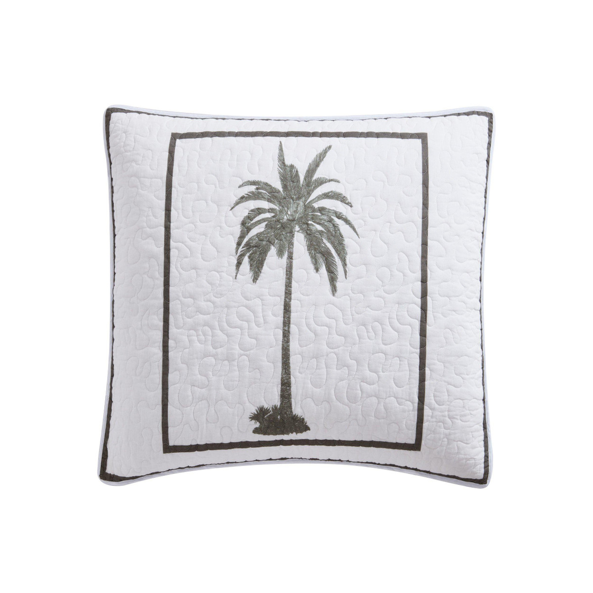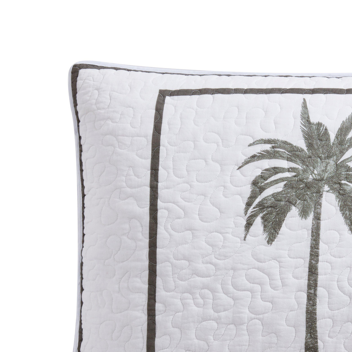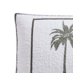 Our Tommy Bahama Palm Island Sham was inspired by the tropical island in Hawaii. Our Tommy Bahama Palm Island Sham features embroidered palm motifs in a beautiful green color on a quilted white ground. The reverse is white. This quilt is 100% cotton, with a 80% cotton,20% polyester filling. The shams feature a two piece back closure. The corners of the sham are rounded to match the quilt, both edges are finished with a fabric binding. Machine washable, for easy care.