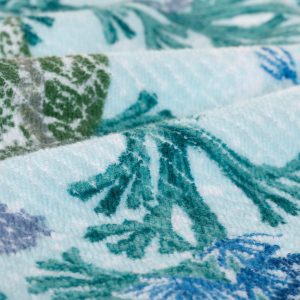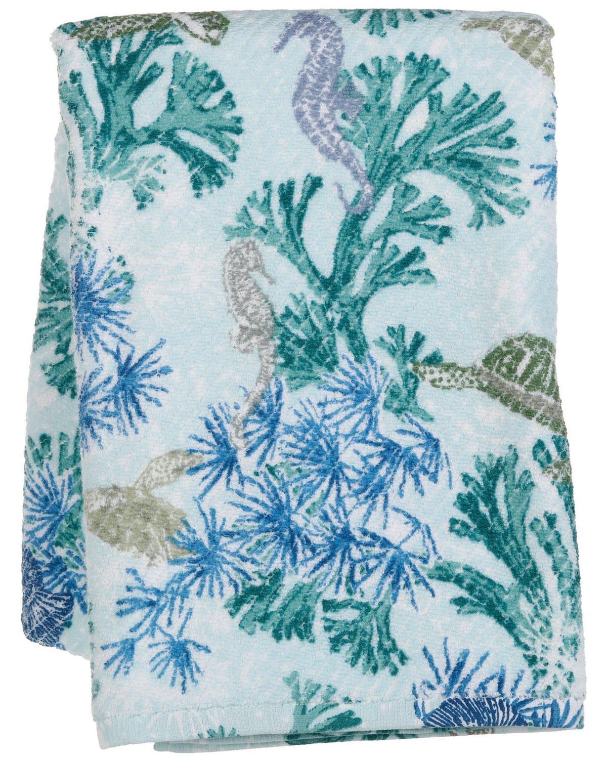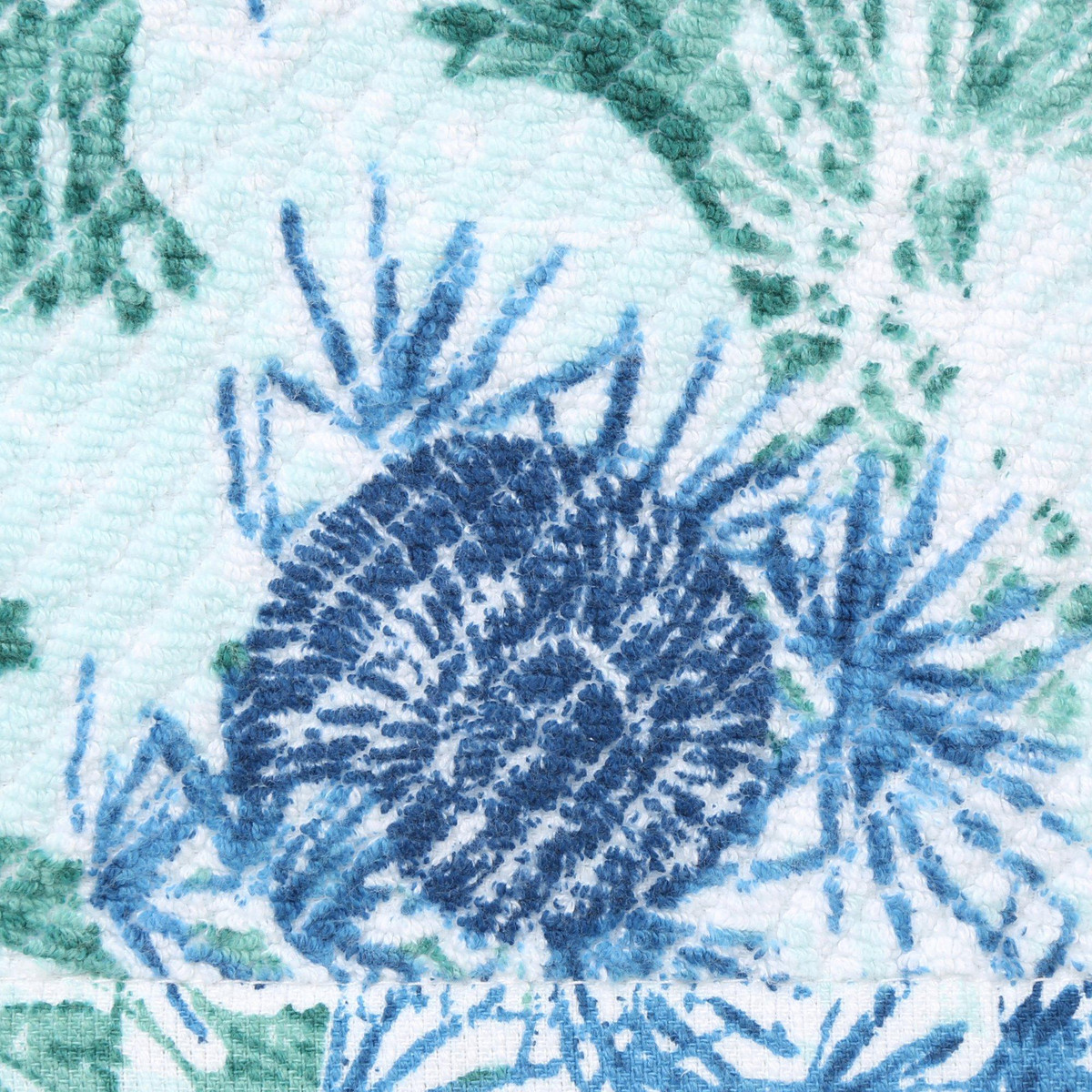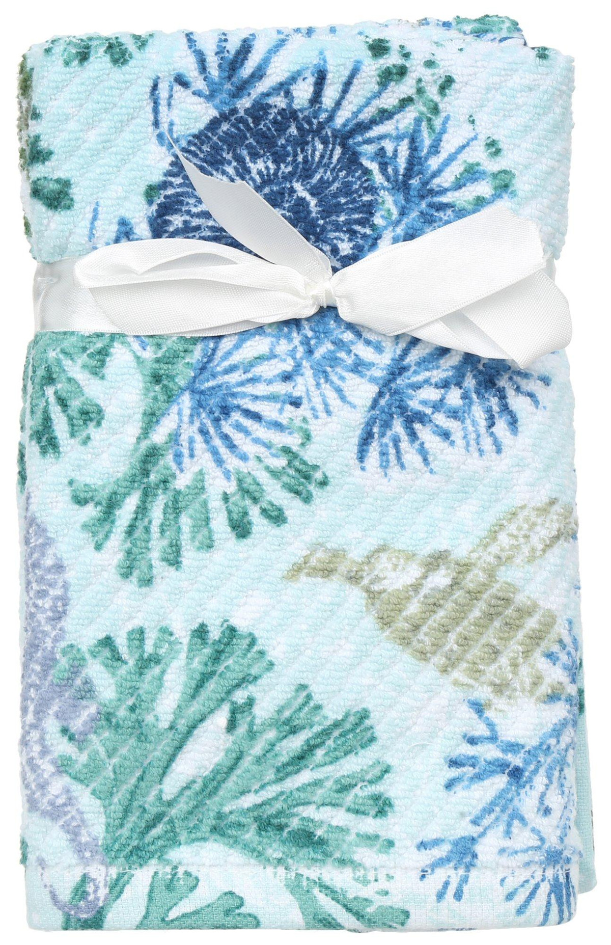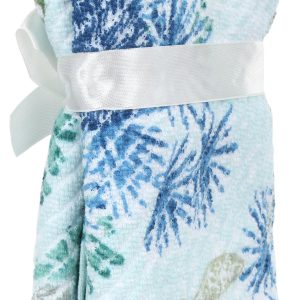 Add a coastal flair to your bathroom with the Pacfic Tide towel collection. The towels feature a soft woven cotton fabric and a colorful print design. Bath towel measures 27 in x 52 in. 2-pack hand towels measure 26 in x 16 in. each. 2-pack fingertip towels measures 12 in x 18 in. each. This towel collection is not a set. Each towel sold separately (hand towel and fingertip towel comes as two-piece sets).