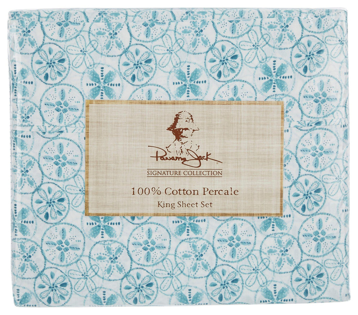 Pick up a piece of the Panama Jack lifestyle and relax into your favorite time and place. This sheet set features a coastal sand dollar design and a comfortable 100% cotton percale fabrication. Set includes one flat sheet, one fitted sheet, and two pillowcases (one for twin size). Thread count: 200tc.
