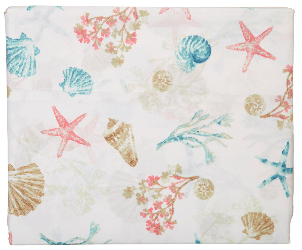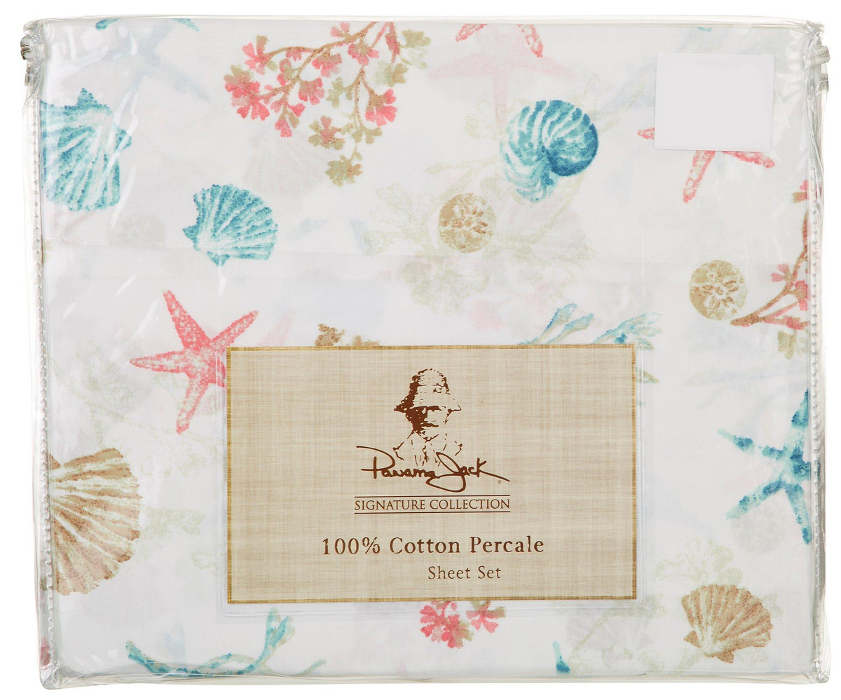 Pick up a piece of the Panama Jack lifestyle and relax into your favorite time and place. This sheet set features a coastal sea shell design and a comfortable 100% cotton percale fabrication. Set includes one flat sheet, one fitted sheet, and two pillowcases (one for twin size). Thread count: 200tc.