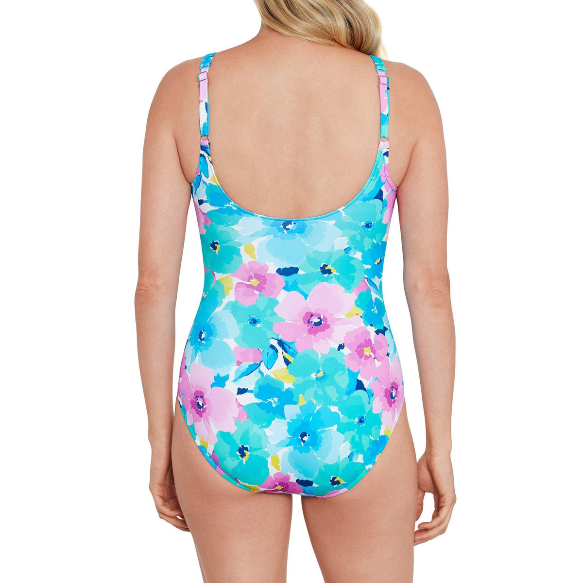 This one piece swimsuit provides full coverage swimwear with a flattering fit. Offering a fun print design, adjustable straps, tummy control, and a flattering silhouette. Fabrication 95% polyester, 5% spandex.