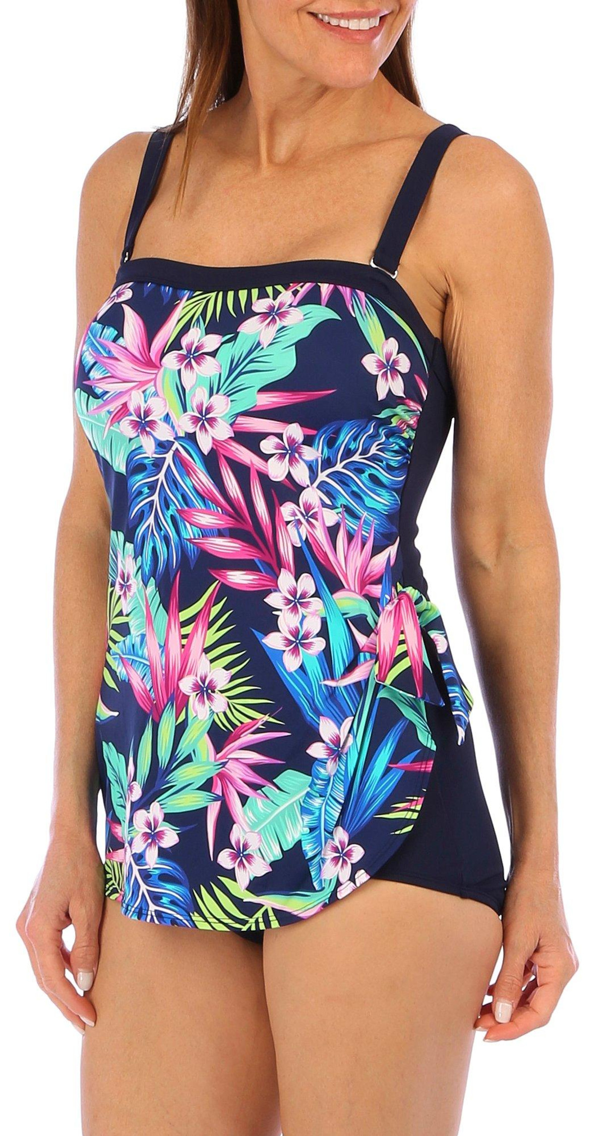 Dive into elegance with our Womens Tropical Floral One Piece Swimsuit. This stunning swimsuit features a stylish tropical floral design that adds a touch of artistry to your swimwear collection. The surong front enhances the overall appeal. This swimsuit offers both style and comfort. Perfect for your next beach or poolside adventure.