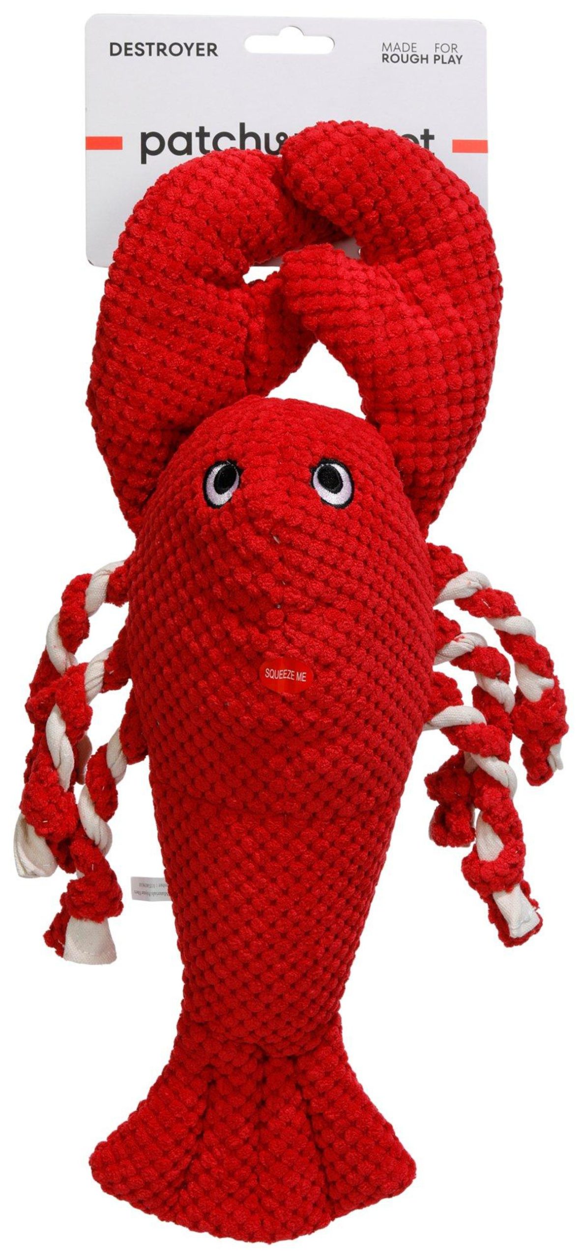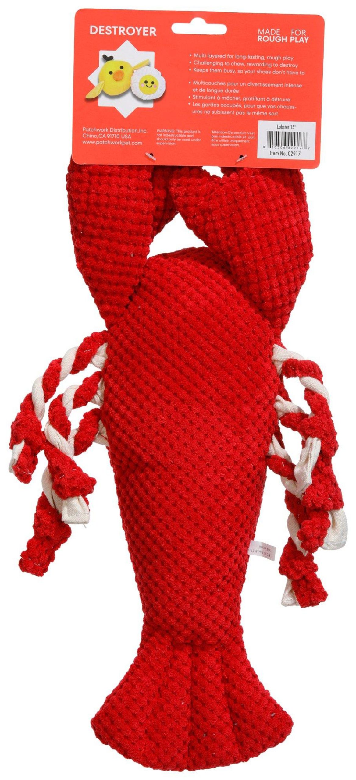 Patchwork Pet offers fun and innovative pet toys for your beloved furry friend. This large plush lobster dog toy features durable construction, double stitched seams, ropes, and a squeaker inside. Measures 15”L.