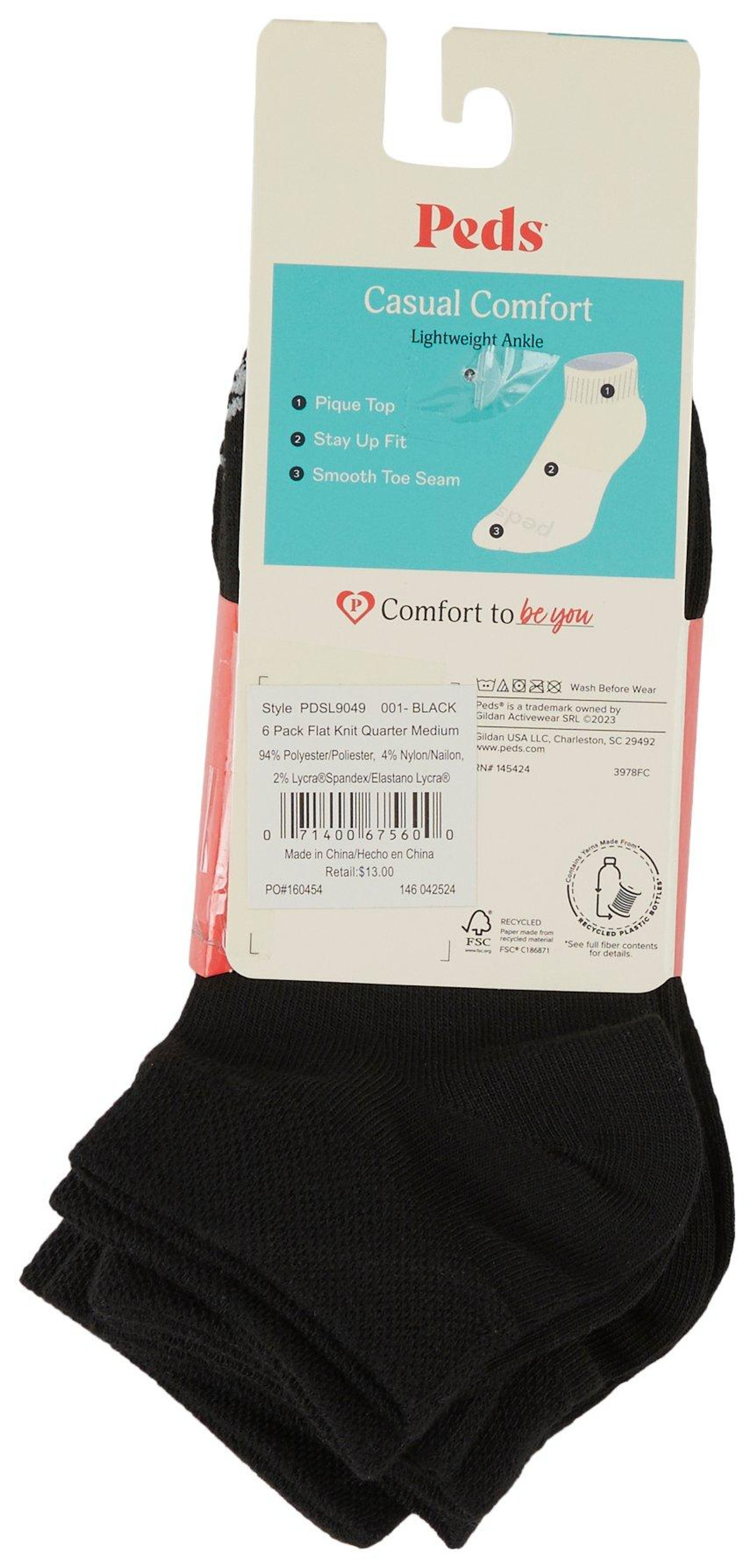 Discover our Women’s 6-Pack Flat Knit Quarter Ankle Socks, crafted from a blend of polyester and lycra for a comfortable and flexible fit. These socks feature a pique top for added texture, a stay-up fit to keep them in place all day, and a smooth toe seam for enhanced comfort. Perfect for everyday wear, they offer both style and practicality, making them an essential addition to your sock collection.