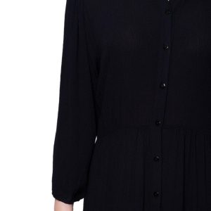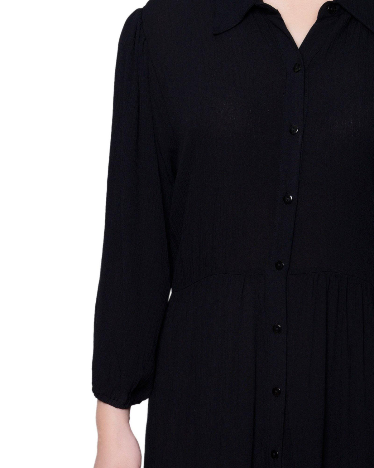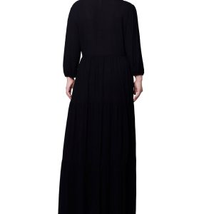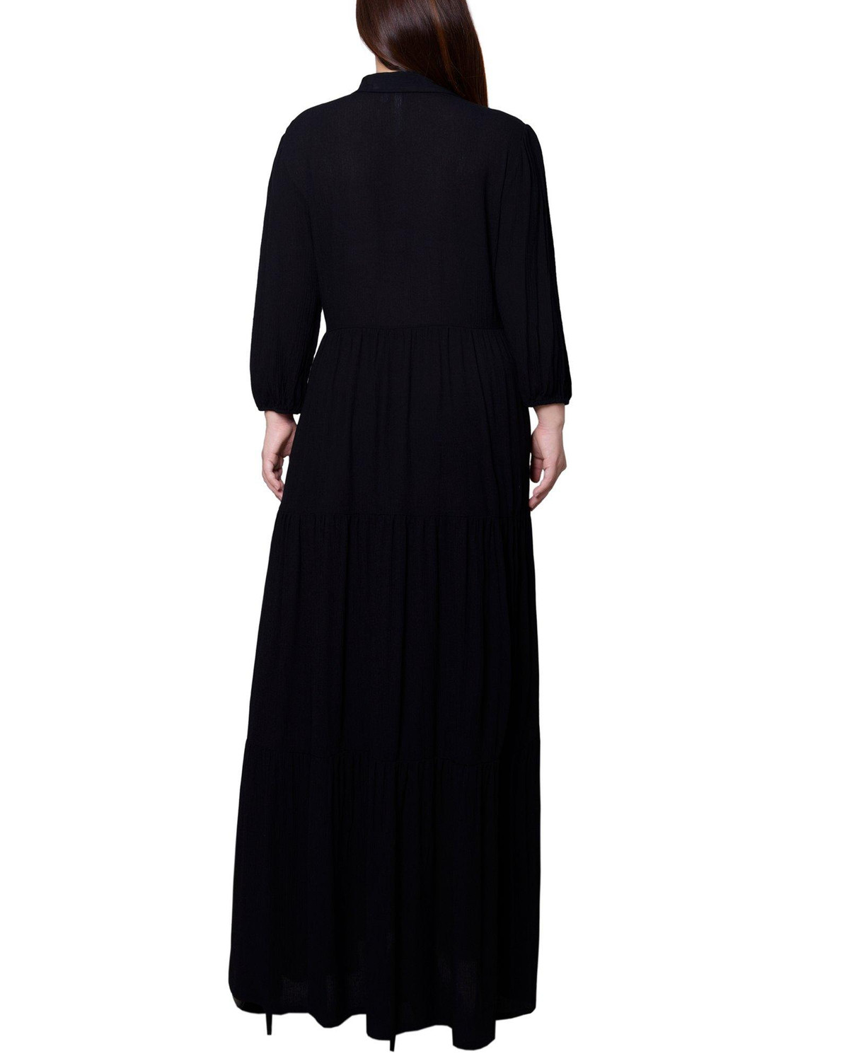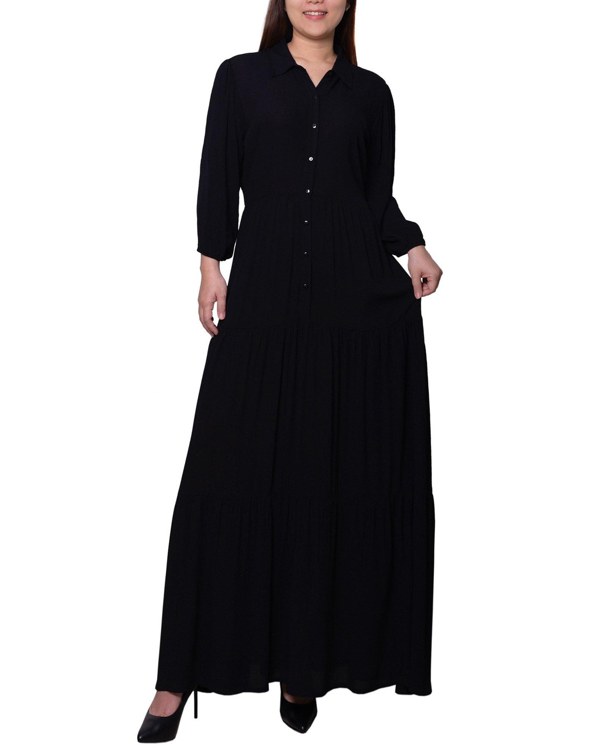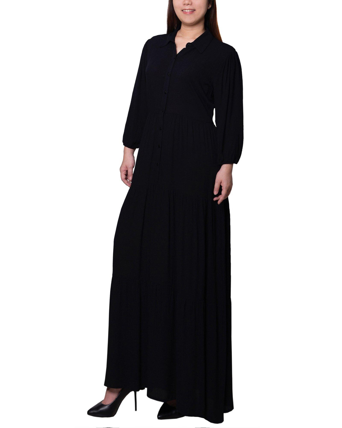 Step into elegance with this solid color maxi dress, featuring chic 3/4 length sleeves and a point collar button-front bodice. Crafted from crinkled rayon fabric, this dress offers a sophisticated look perfect for both dining out and working at the office. Its timeless design ensures you stay stylish and polished for any occasion. Length measures approximately 53 in. Fabrication 100% rayon.