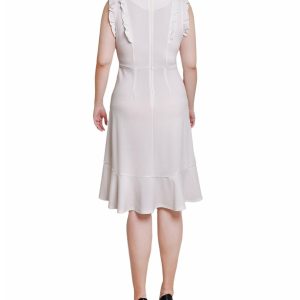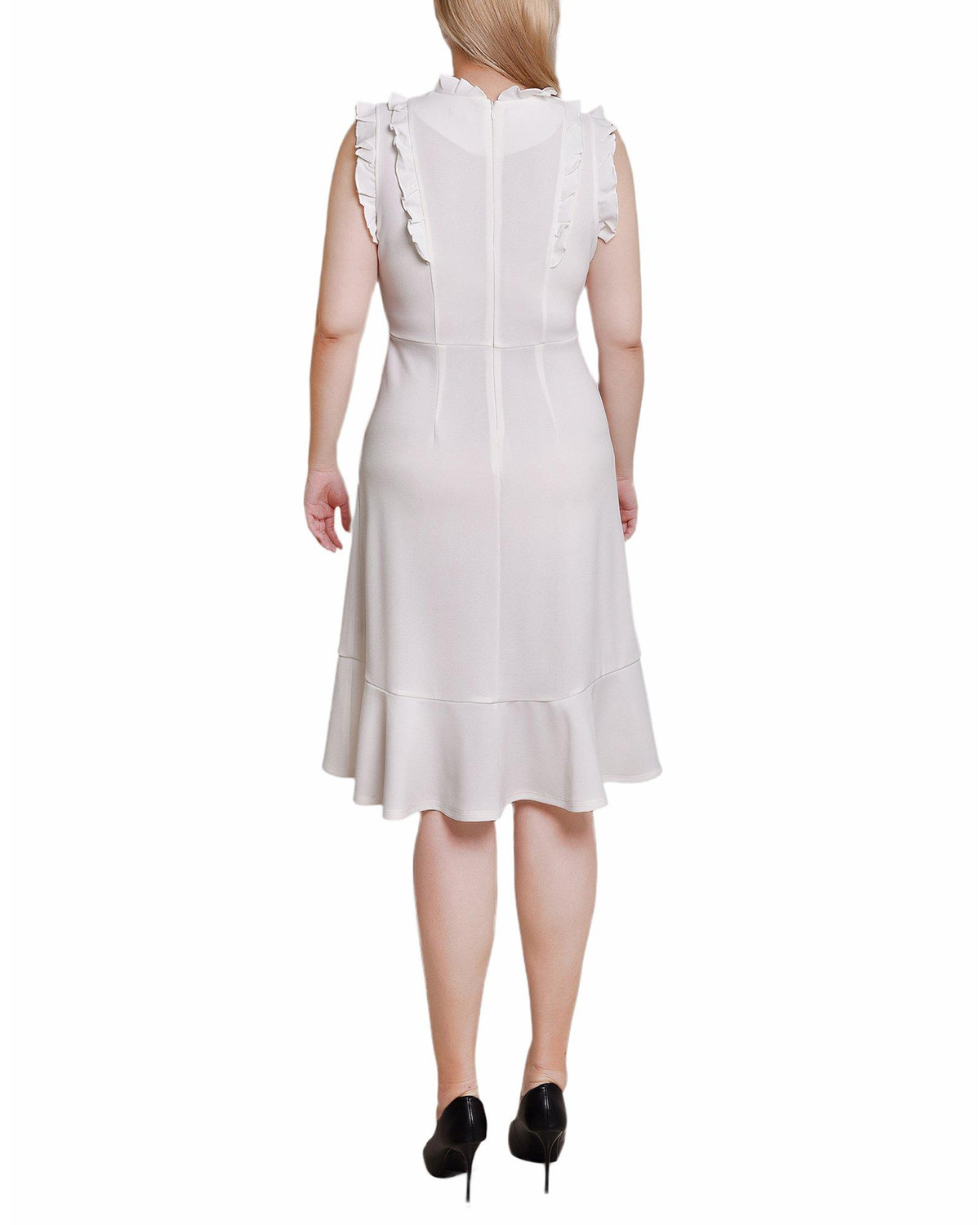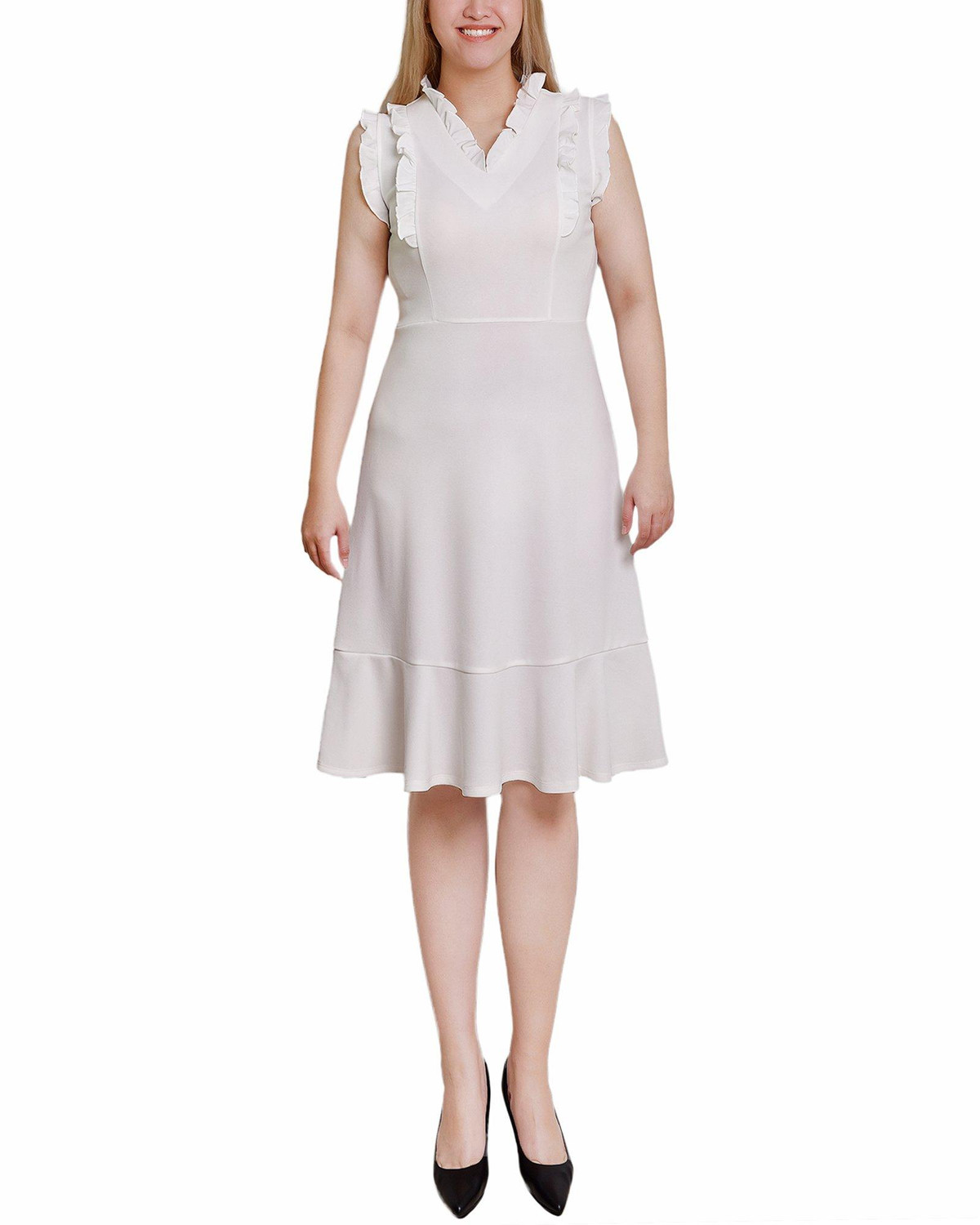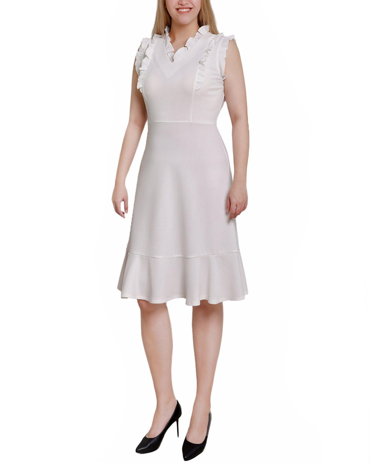 Elevate your style with this chic flutter sleeve dress, featuring a playful V-neck with ruffle detail and a flounced hem. Made from comfortable scuba fabric, this dress is perfect for both work and play. Its fun and flirty design ensures you look effortlessly stylish, whether youre at the office or out for a night on the town. Length measures approximately 39 in. Fabrication 95% polyester, 5% spandex.