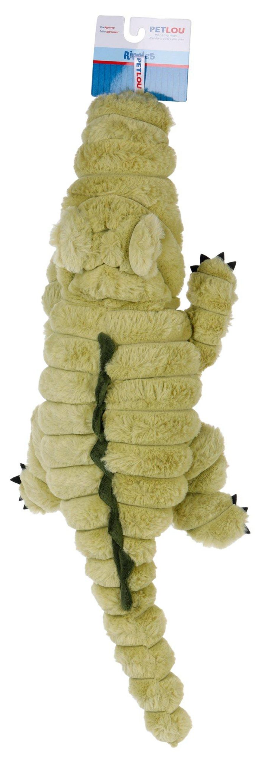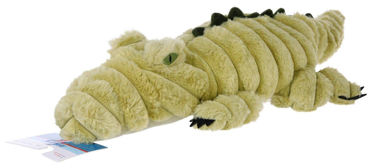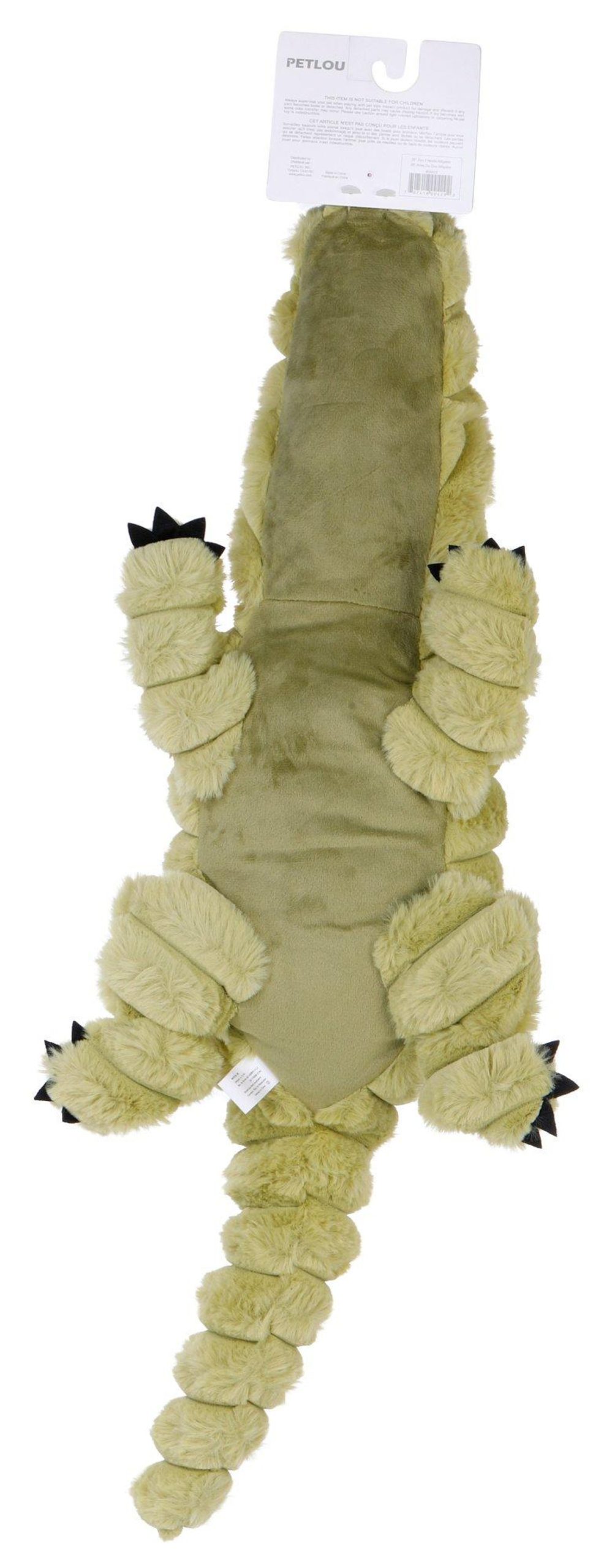 Bring interactive fun to playtime with this plush alligator dog toy, crafted from rich, soft fabric in vibrant colors with embroidered eyes for safe, worry-free play. Packed with sound and texture, it features a grunter in the body, a squeaker in the nose and crinkle paper in the feet to keep pets engaged and entertained. Ideal for cuddling, tossing or tugging. Measures approximately 26 in.