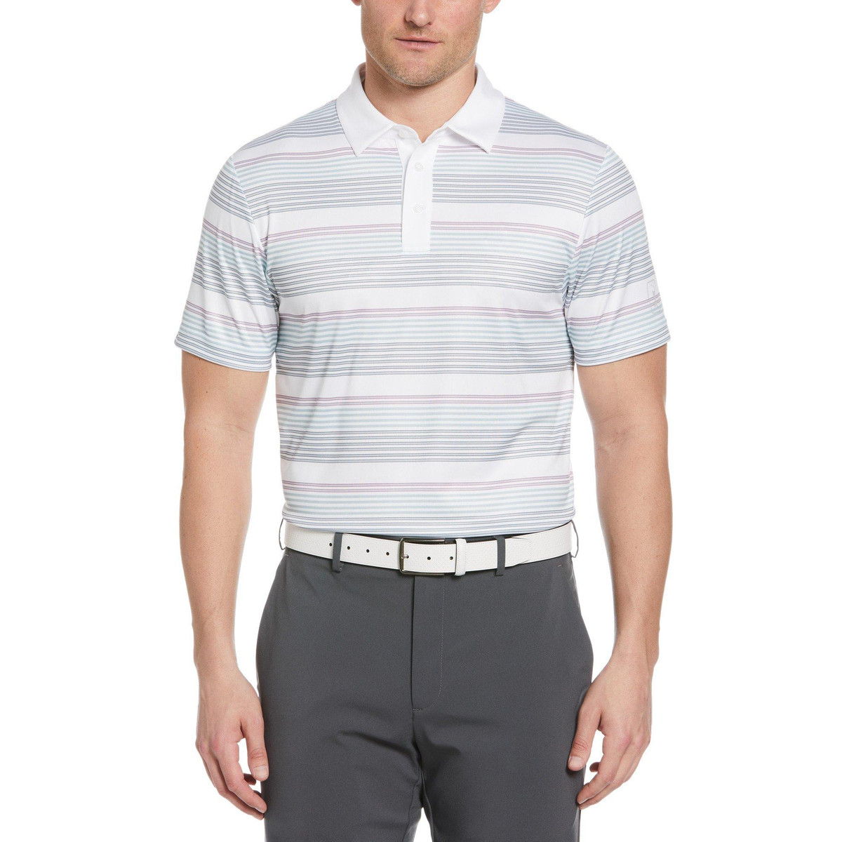This mens golf polo is always a smart casual-wear choice. Interlock fabrication provides natural stretch for all-day comfort while the stretch shoulder seams allow for flexible freedom of movement. This short-sleeve golf shirt features an all-over energy stripe print for a fresh, fashionable look. Fabrication is 100% polyester.
