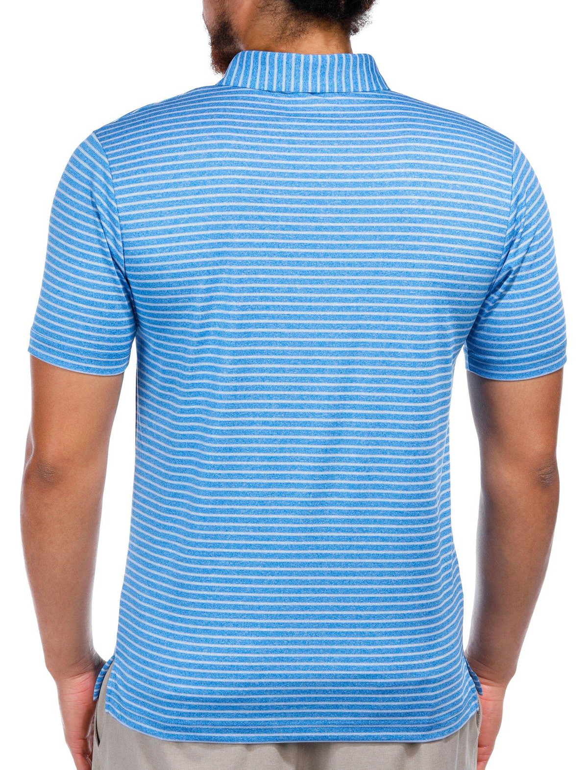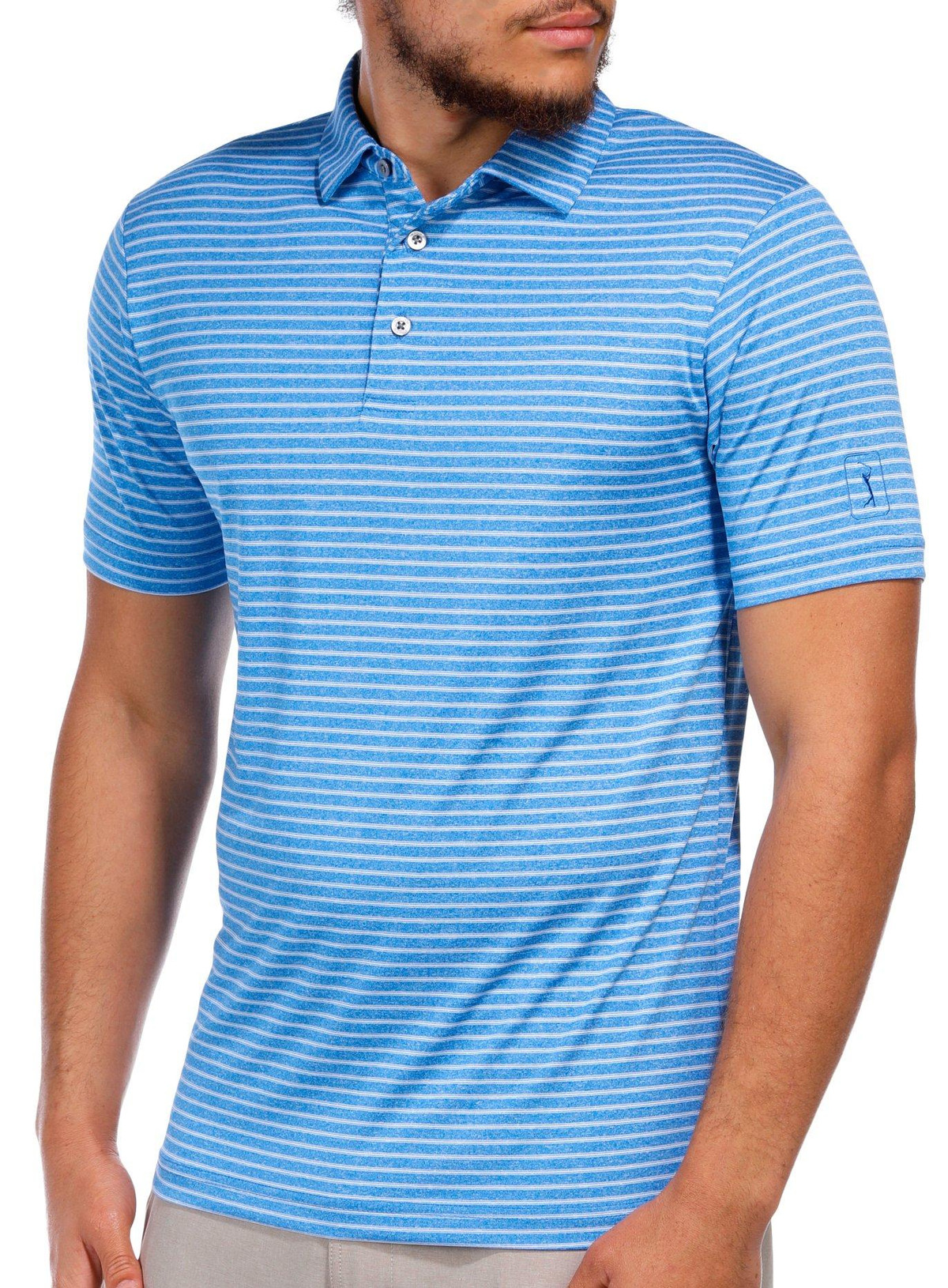 Gear up for the golf course in this stylish and dependable golf polo! It features a unique stripe print design, polo collar, and breathable fabric. Fabrication is 92% polyester, 8% elastane.