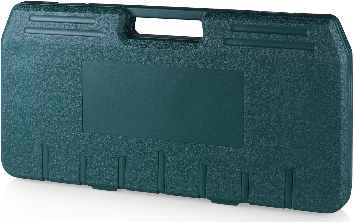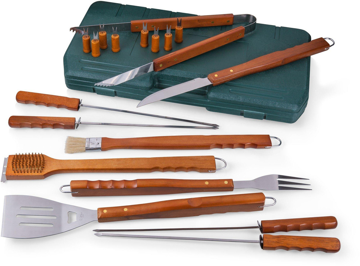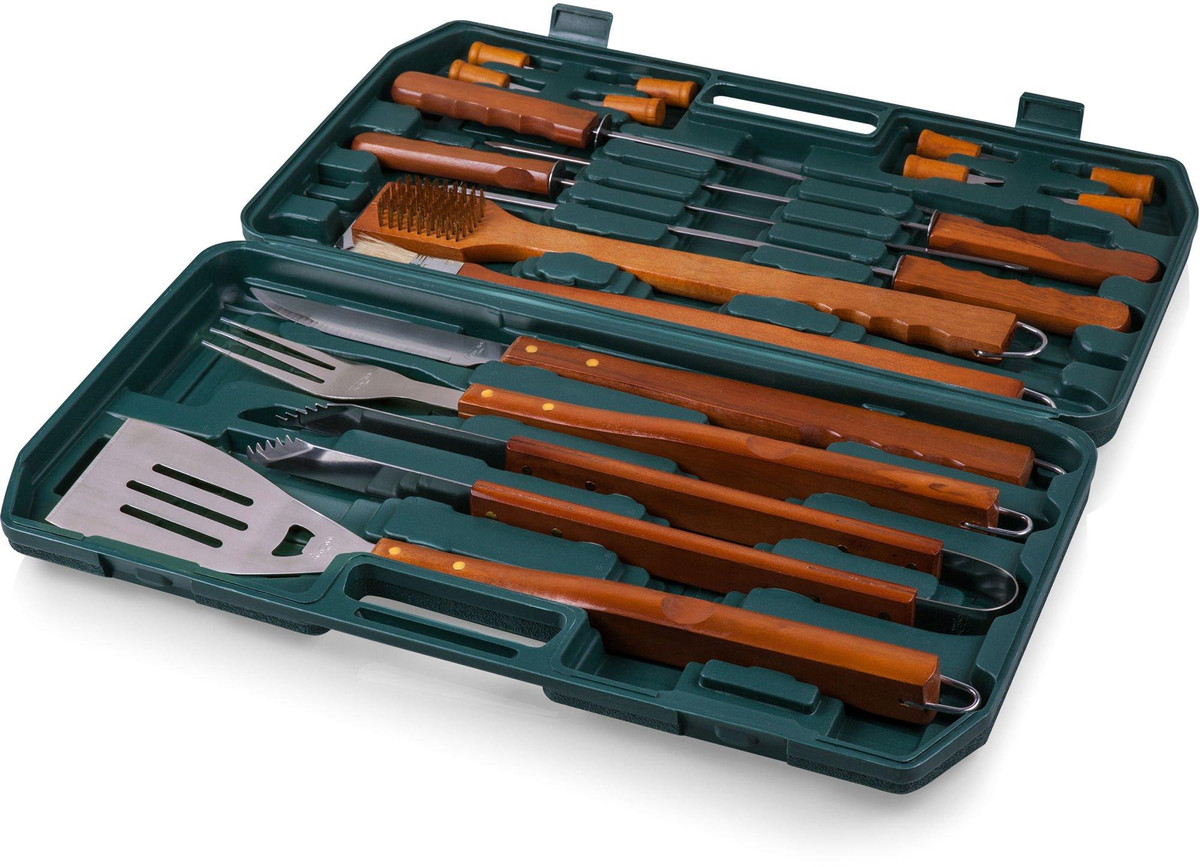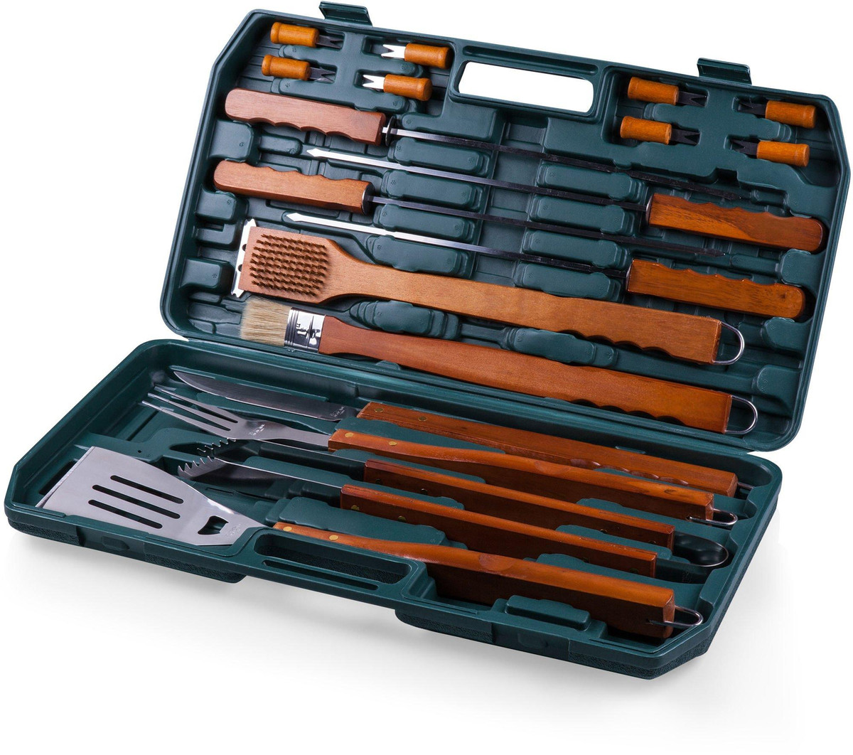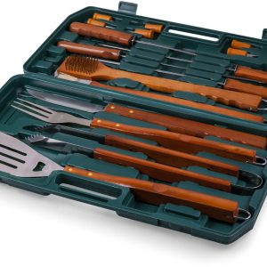This 18-piece BBQ Tool Set features extra long wood and stainless steel handles with loops at the ends of their handles. Includes plastic case, a spatula, tongs, fork, knife, basting brush, 4 skewers, 8 corncob holders, and a grill brush with scraper. Measures 23” x 12” x 3”.