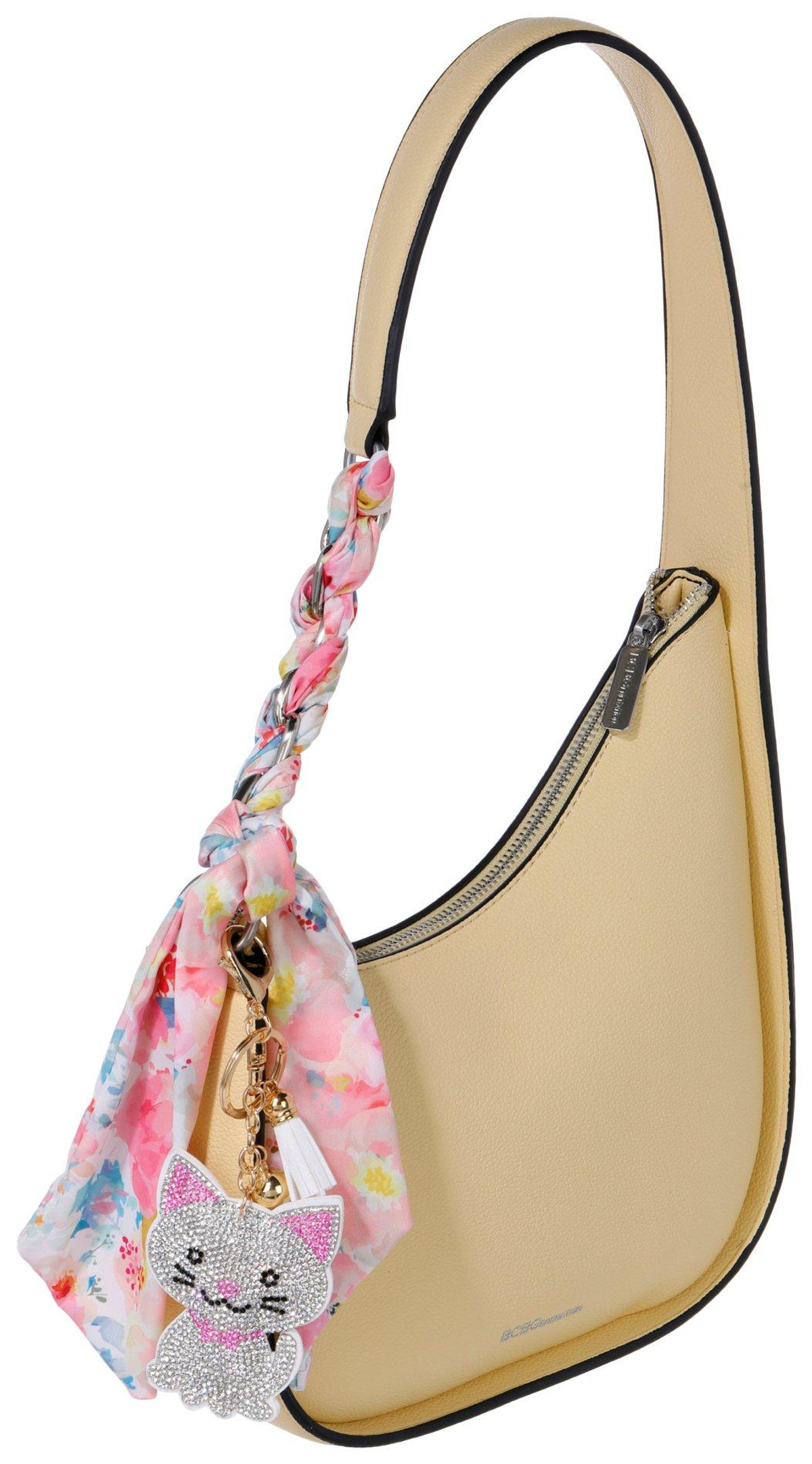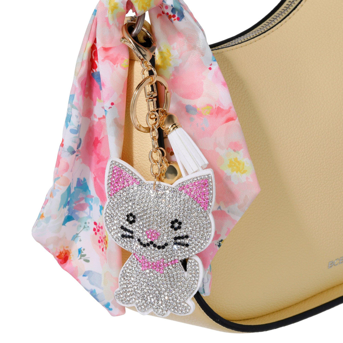 Add a playful sparkle to your accessories with the Pink Ear Cat Bag Charm. Featuring a rhinestone-studded exterior, adorable cat design with pink ears, and a gold lobster clasp, this 3-inch charm is a purr-fect accent for bags or keychains.