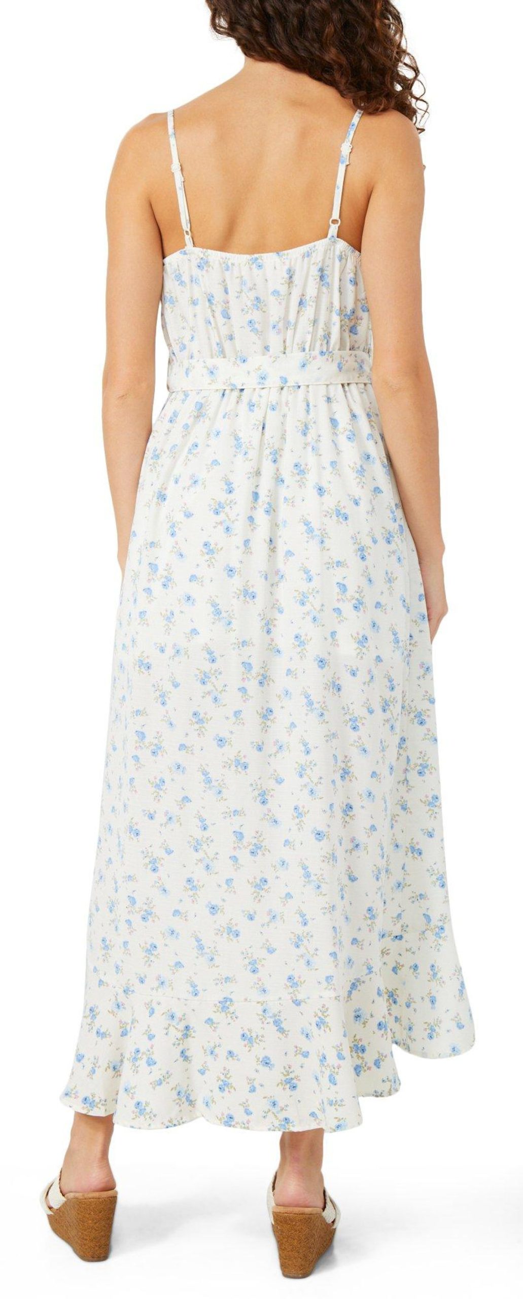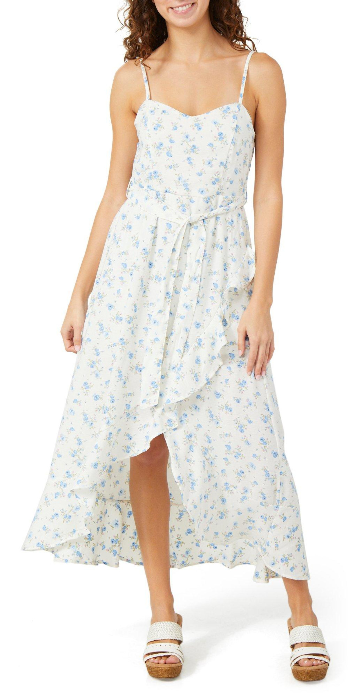 Feminine and flowy, the Juniors Sleeveless Floral Ruffle Wrap Dress features a charming floral print, adjustable straps, and a flattering ruffle wrap design. The midi length adds a touch of elegance, perfect for day-to-night style. Fabrication 100% polyester