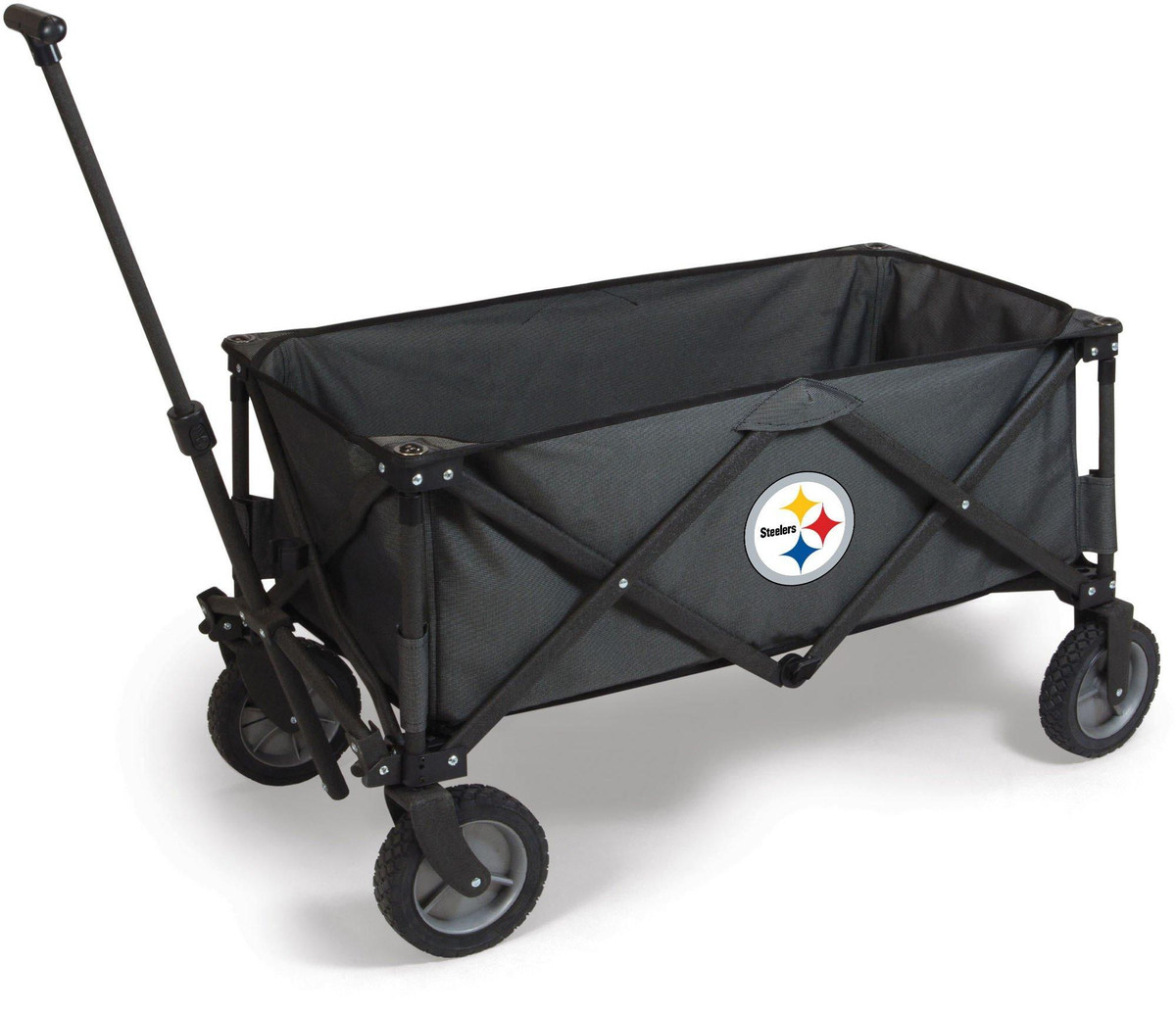 The Adventure Wagon is a utility wagon with heavy-duty wheels & telescopic handle that folds into a compact size and includes a fitted cover. Made of 600D polyester with a powder coated steel frame. Measures: 35.6” x 18.9” x 21.9” open, 10” x 11” x 30” closed.