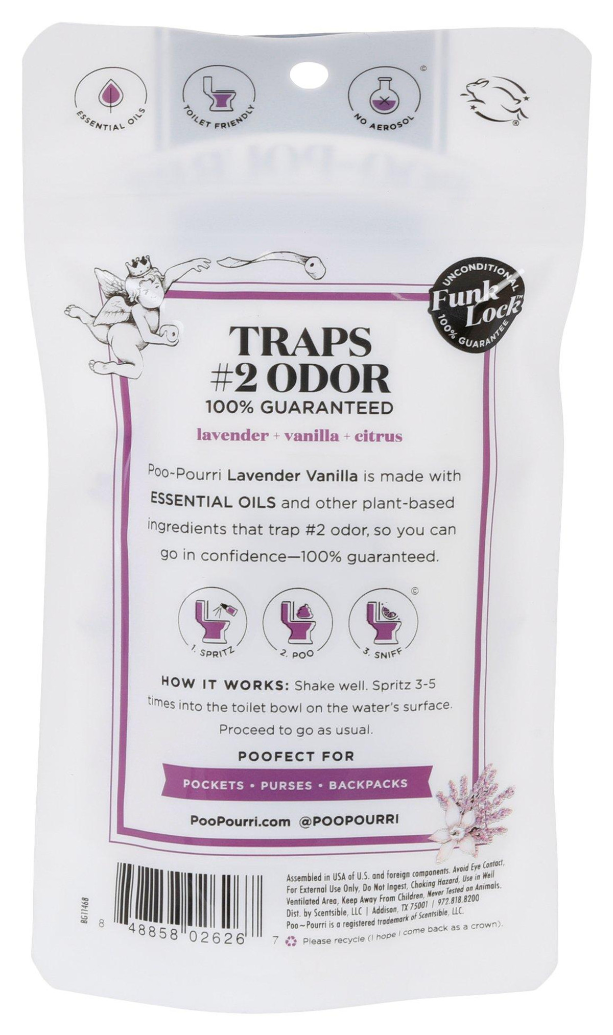 The Lavender Vanilla Pocket Sprayer is a perfectly pocket-sized Poo~Pourri bottle thats great for on the go! Made with essential oils and leaves the toilet smelling better than you found it. 1 FL OZ.