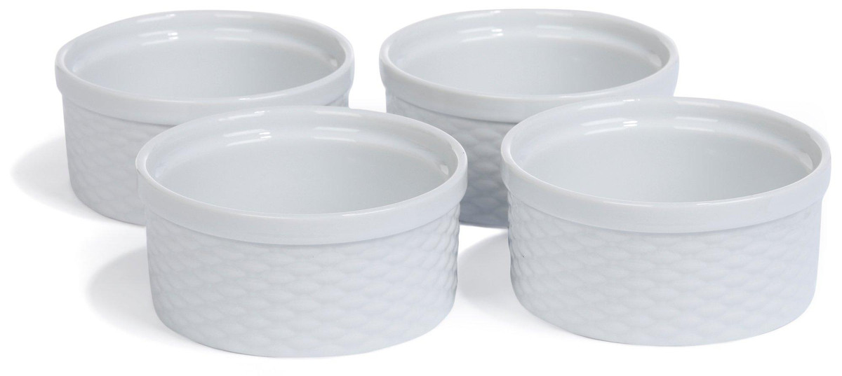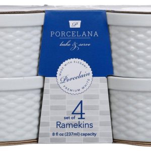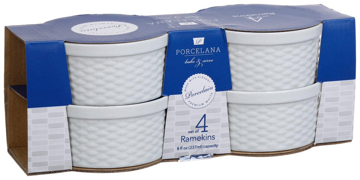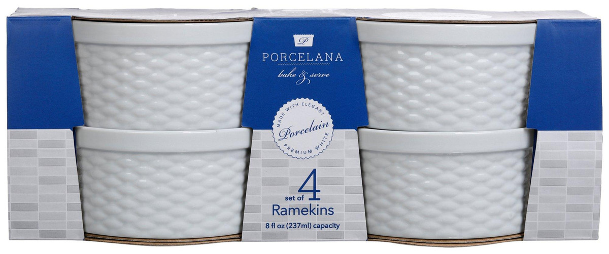 Enhance your culinary presentations with this 4-pack of Porcelain Basket Weave Ramekins. Each ramekin holds 8 ounces, making them perfect for individual servings of soufflés, custards, or appetizers. The elegant basket weave design adds a touch of sophistication to your table setting. Crafted from high-quality porcelain, these ramekins are both durable and stylish, ideal for both everyday use and special occasions.