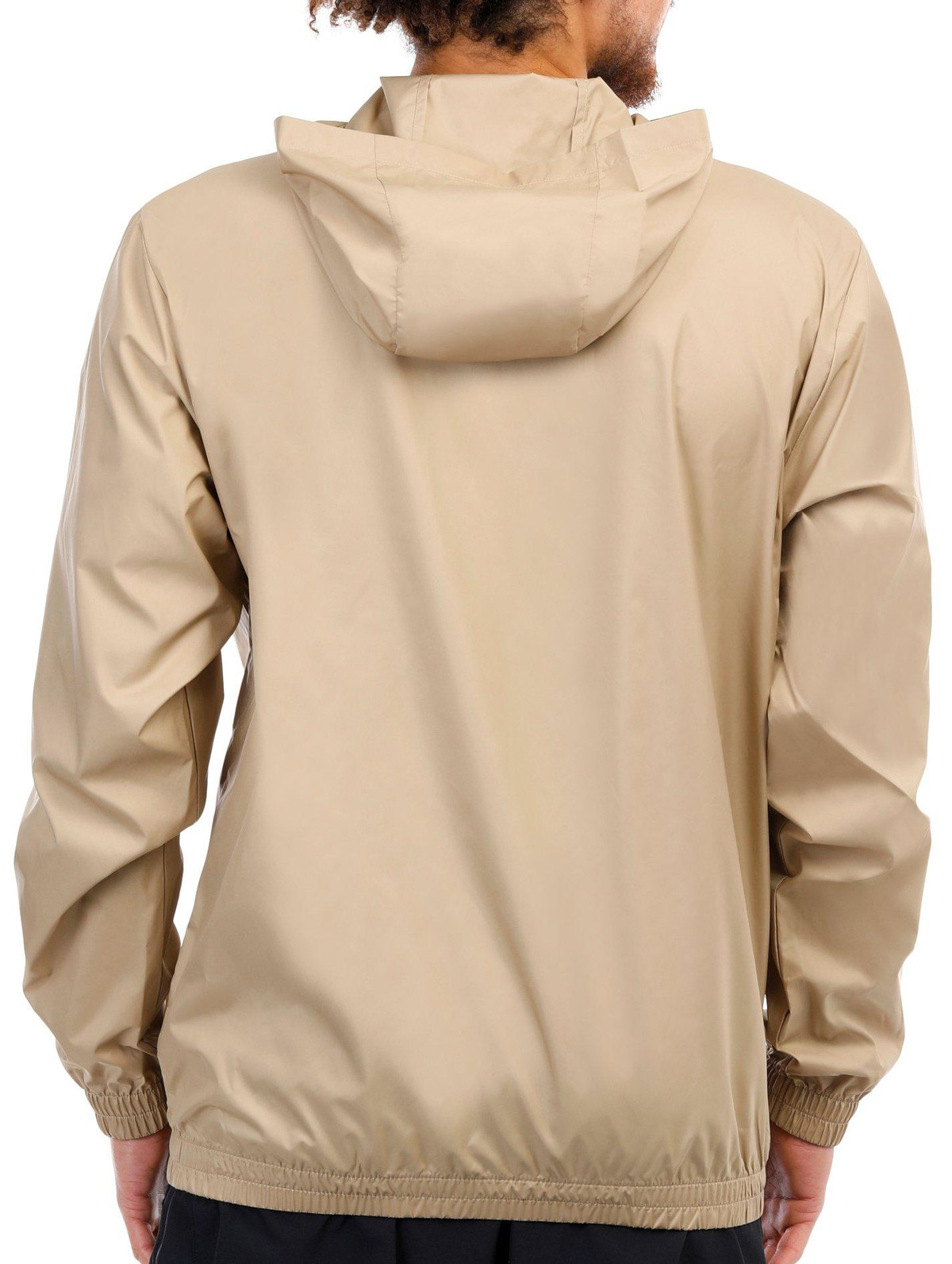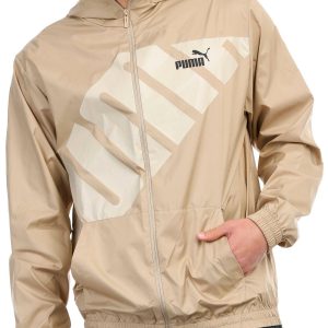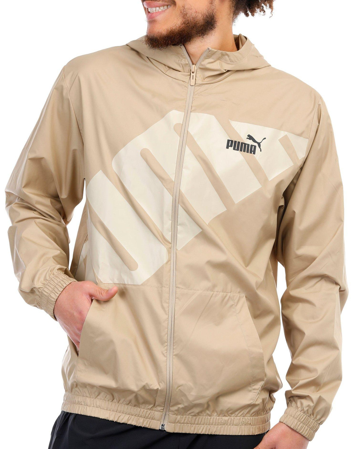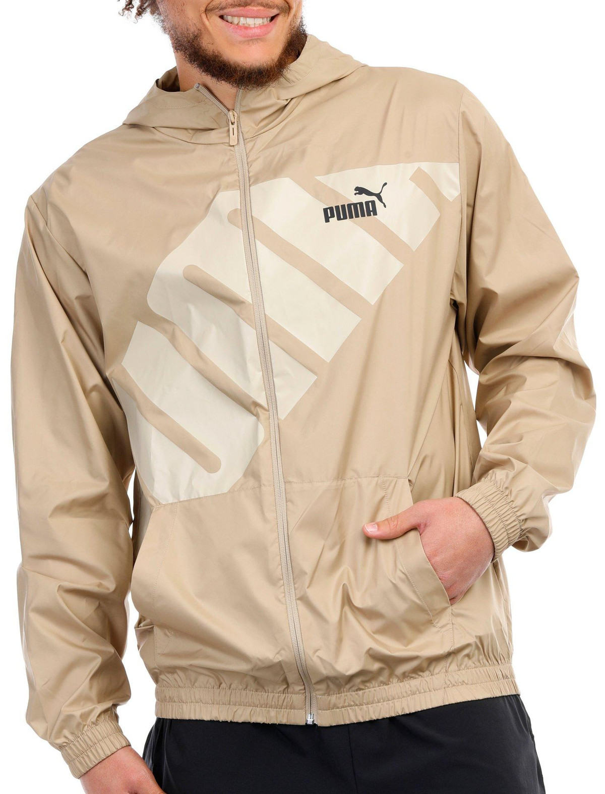 This graphic windbreaker features a bold front logo with a full front zipper and a hood, it is light weight and stylish, keeps you warm and looking good in cool weather. Fabrication is 100% polyester.