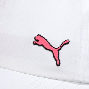 Sport a clean, classic look with this white Puma baseball cap, featuring a vibrant pink Puma logo and curved brim. Lightweight and adjustable for comfort, perfect for workouts, casual wear, and sunny days.
