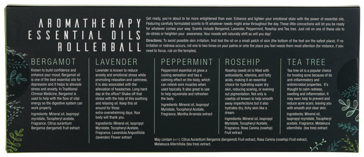 Support your well being anytime with the 5 Pc Aromatherapy Essential Oil Rollerball Set. Includes Bergamot, Lavender, Peppermint, Rosehip, and Tea Tree oils in convenient rollerball bottle for easy application. Ideal for relaxation, focus, and on the go aromatherapy use. Each holds .43 fl oz.