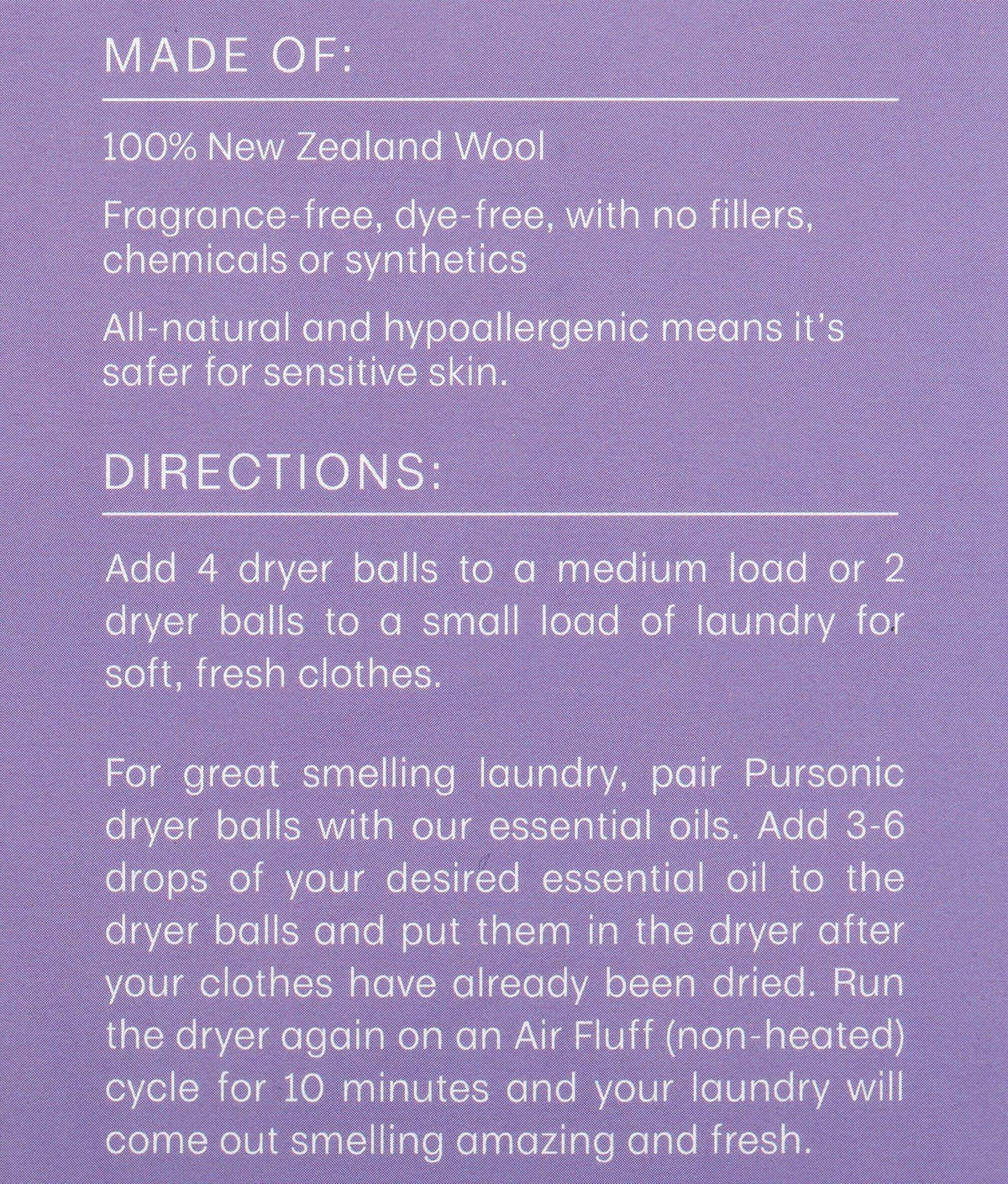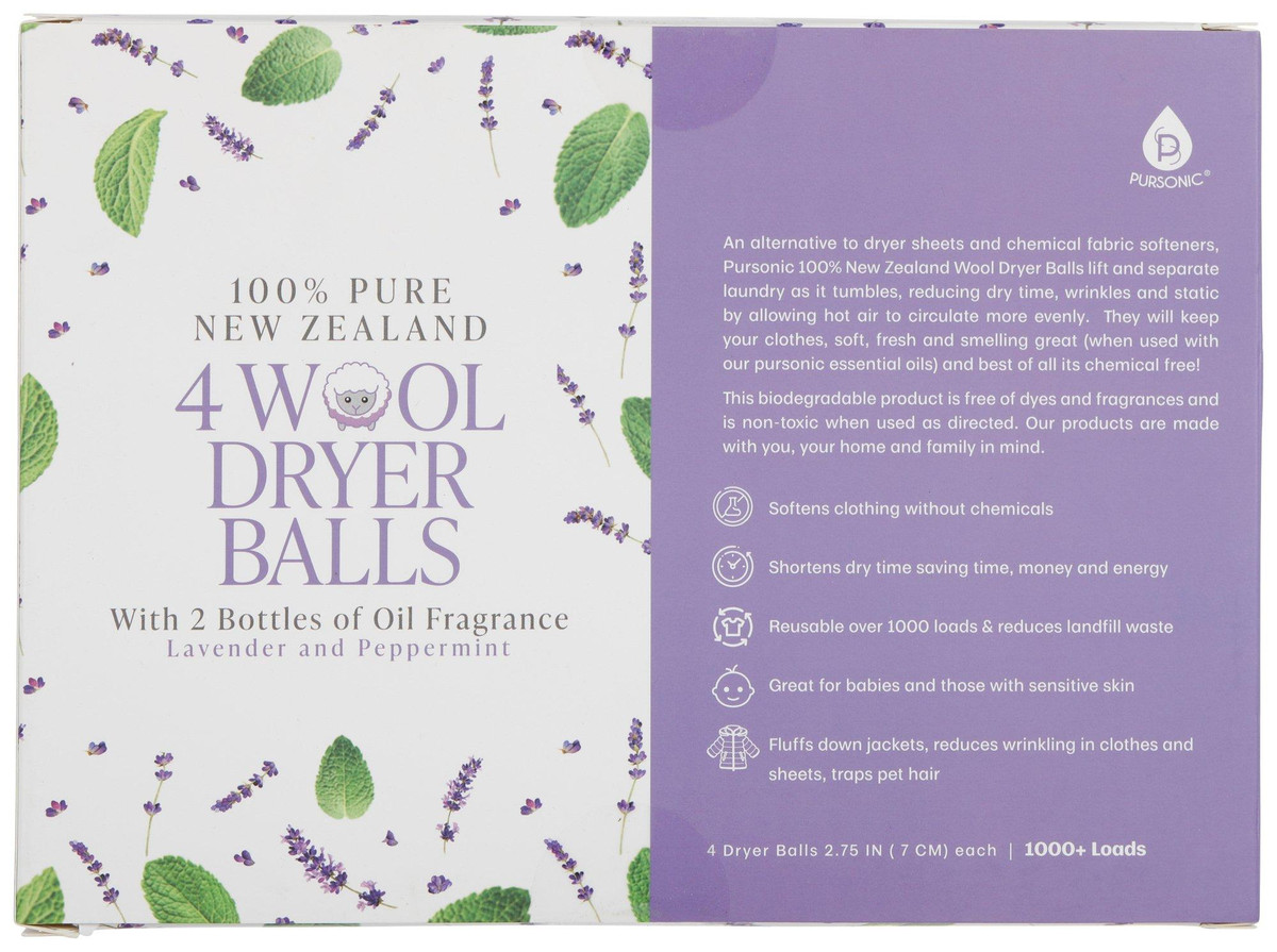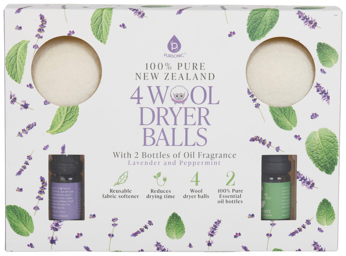 Simplify laundry care with the 6 Pc Wool Dryer Balls & Essential Oils Set. Made from 100% pure New Zealand wool, the dryer balls naturally soften fabrics and reduce drying time. Includes Lavender and Peppermint essential oils for added freshness. Good for 1000+ loads. Ideal for sustainable and chemical free laundry routines.