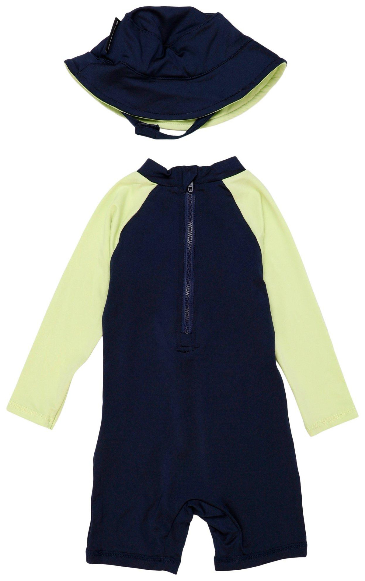 Gear up your little one for sunny adventures with this Baby Boys 2-Piece Rashguard and Hat Set. The long-sleeve rashguard offers UPF 50 sun protection and features a stylish chest logo for a sporty look. Paired with a matching bucket hat complete with a secure Velcro chin strap, this set keeps your baby protected and comfortable all day. Fabrication is 88% polyester, 12% spandex. Length measures approximately 17 in.
