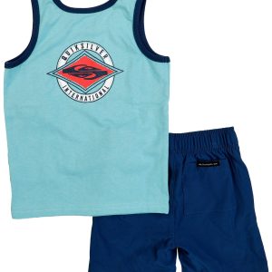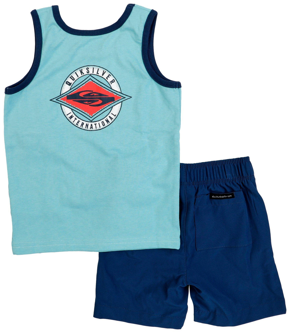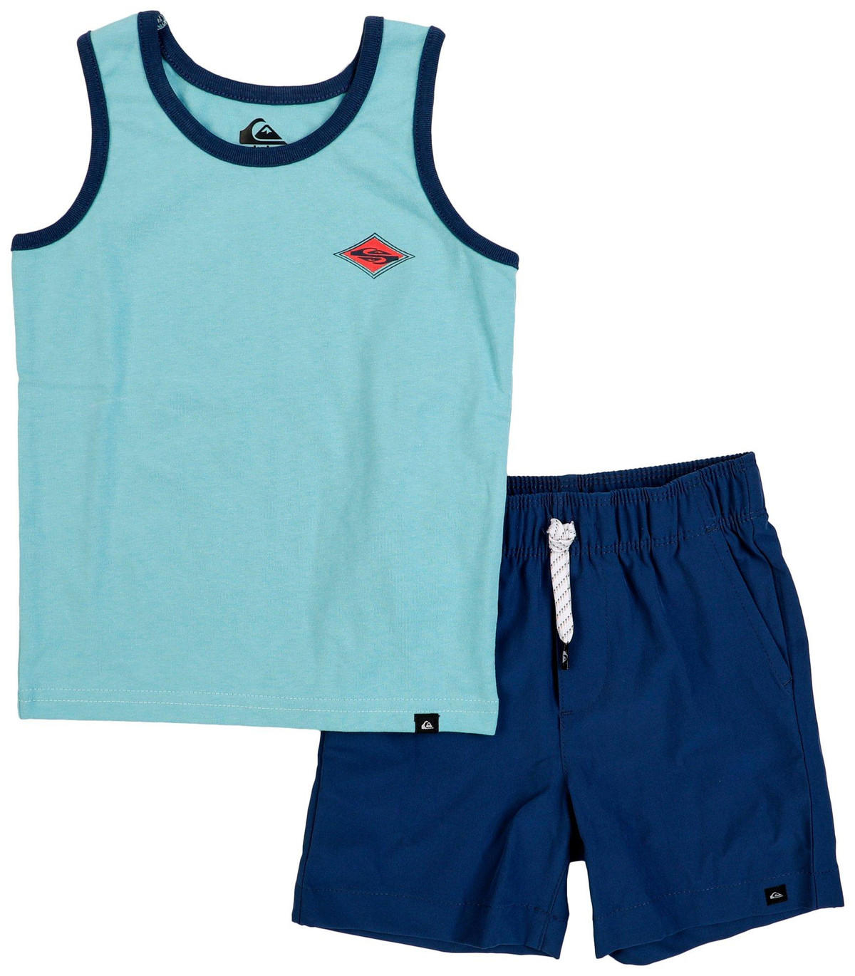 Elevate your casual look with this 2 pc tank and short set, designed for comfort and style. This set includes a graphic logo tank that adds a playful touch to any outfit. Paired with elastic waist shorts featuring a solid fabric design and double side slip pockets. This set ensures practicality and ease for active days. Fabrication is: Shirt 60% cotton, 40% polyester, Shorts 92% polyester, 8% spandex.