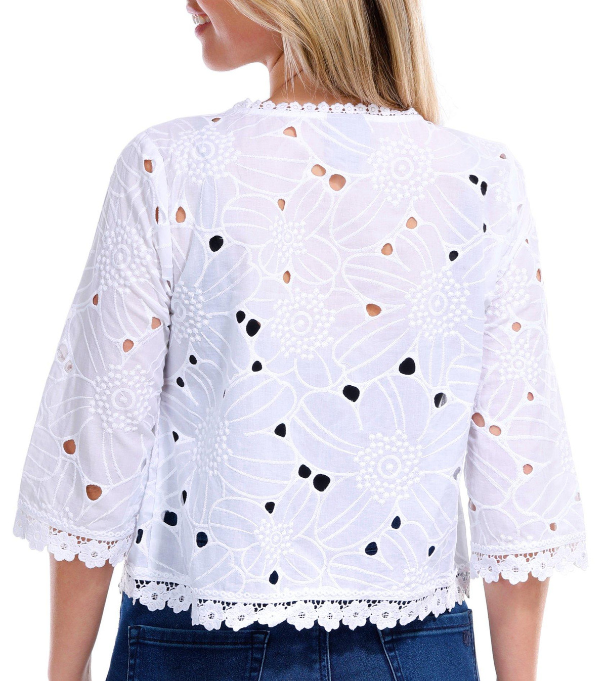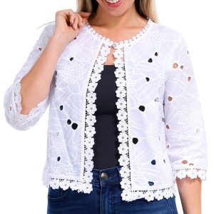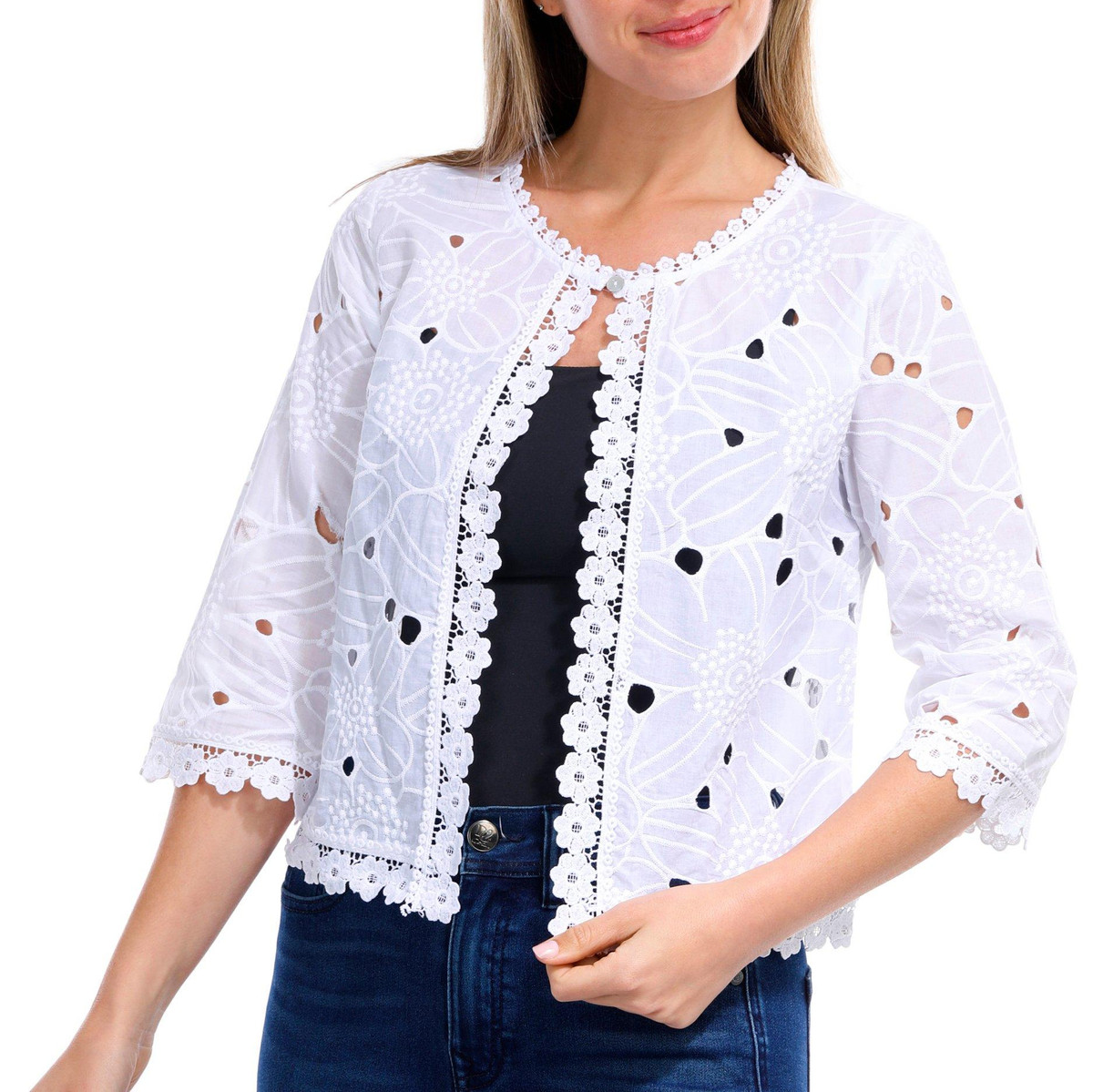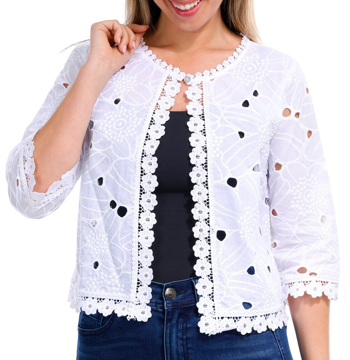 Elevate your outfit with this 3/4 Sleeve Open Shrug. Crafted from delicate lace fabric, this shrug adds a touch of elegance and sophistication to any ensemble. The open design makes it perfect for layering over dresses or tops, while the 3/4 sleeves provide a chic and versatile look.