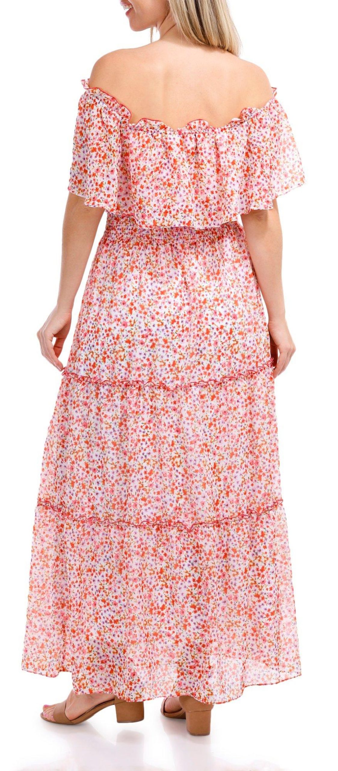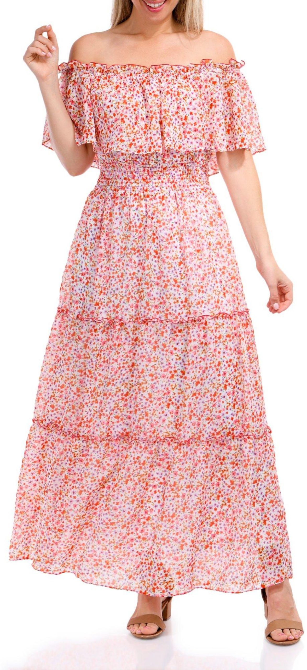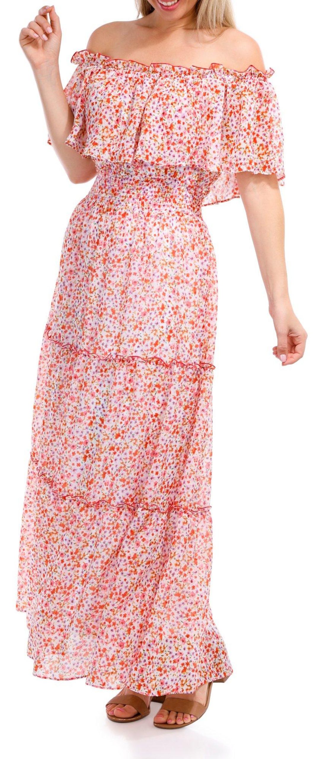 Elevate your style with the Off the Shoulder Floral Maxi Dress. This lined dress features a stunning floral print that exudes charm and sophistication. The off-the-shoulder design adds a touch of romance, perfect for any special occasion. Its flowing maxi length creates a graceful silhouette, while the comfortable lining ensures you feel as good as you look.
