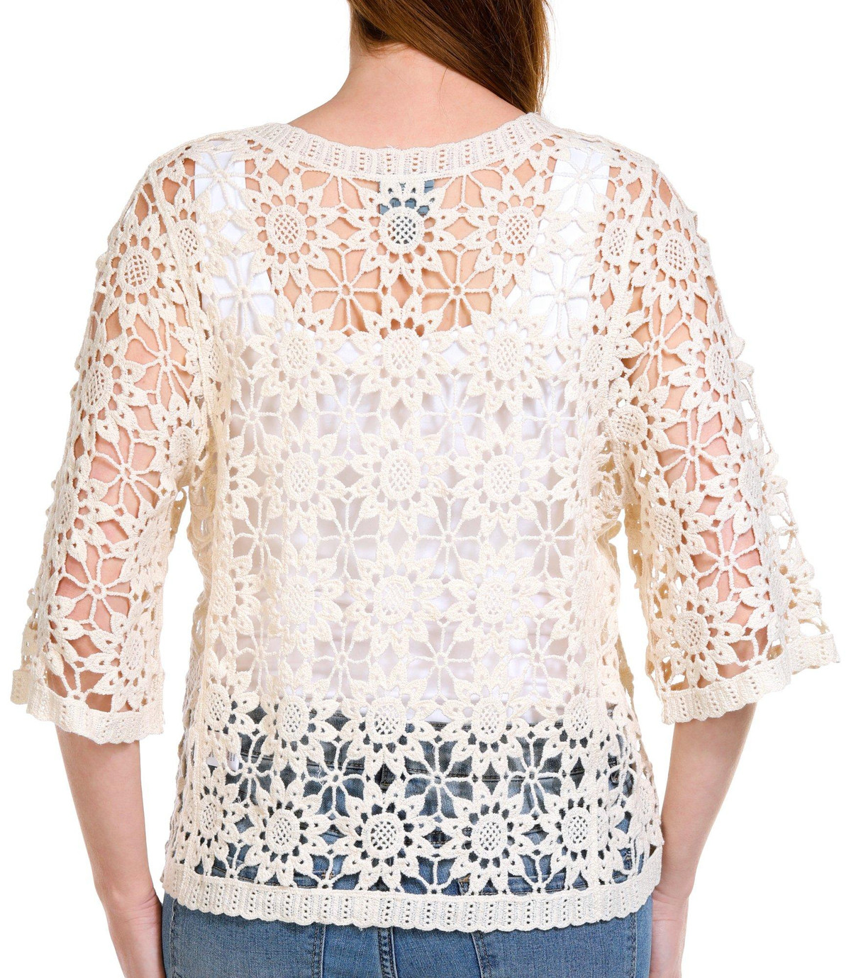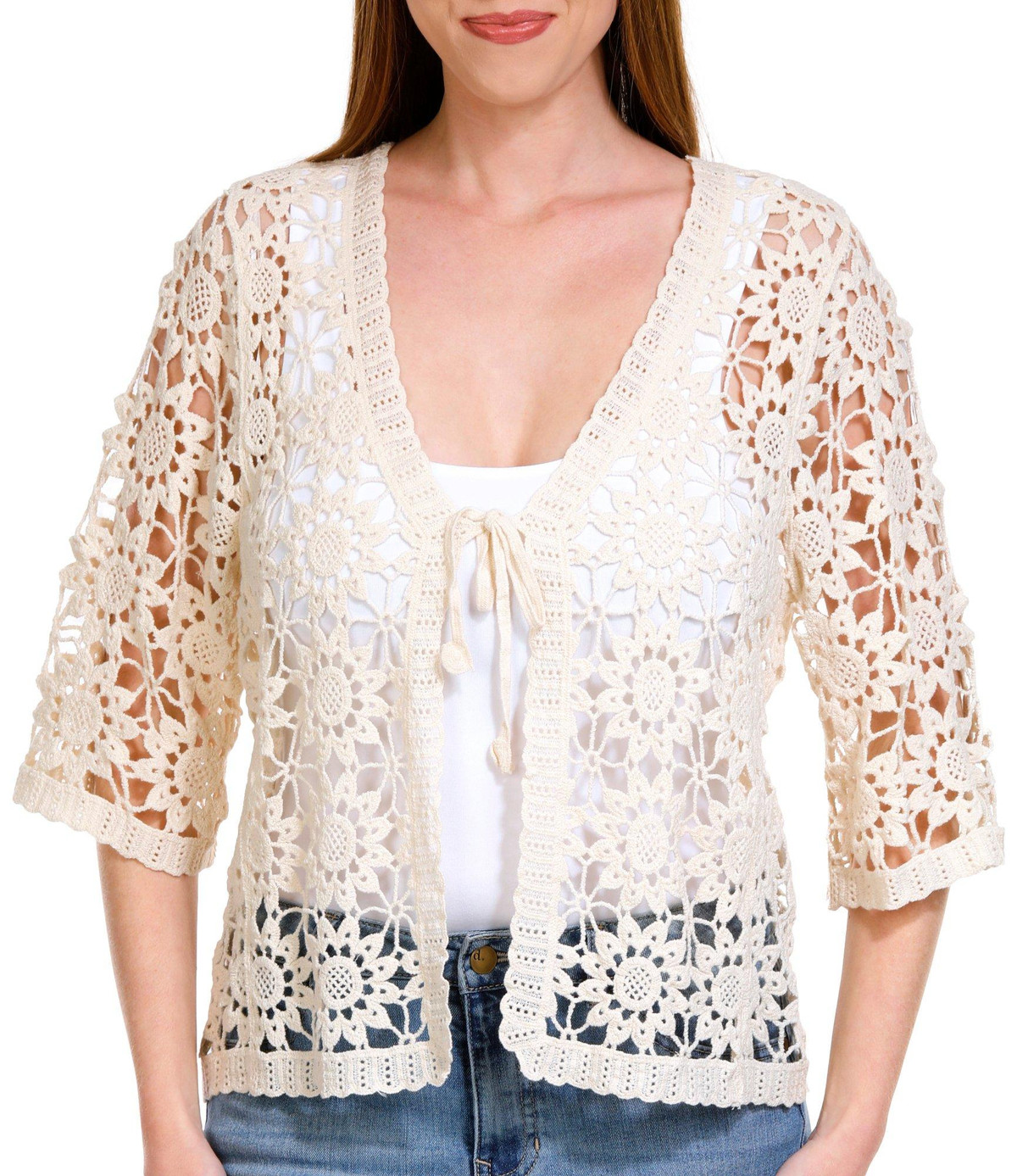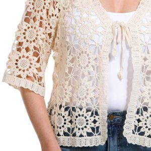 Introducing the Women’s Sun Crochet Shrug, crafted from 100% cotton for a soft and breathable fit. This charming shrug features short sleeves, a tie front closure, and an intricate crocheted sun pattern. Perfect for layering over your favorite outfits, it adds a touch of warmth and elegance to your look.