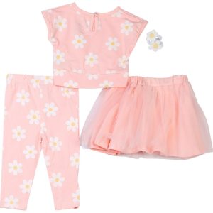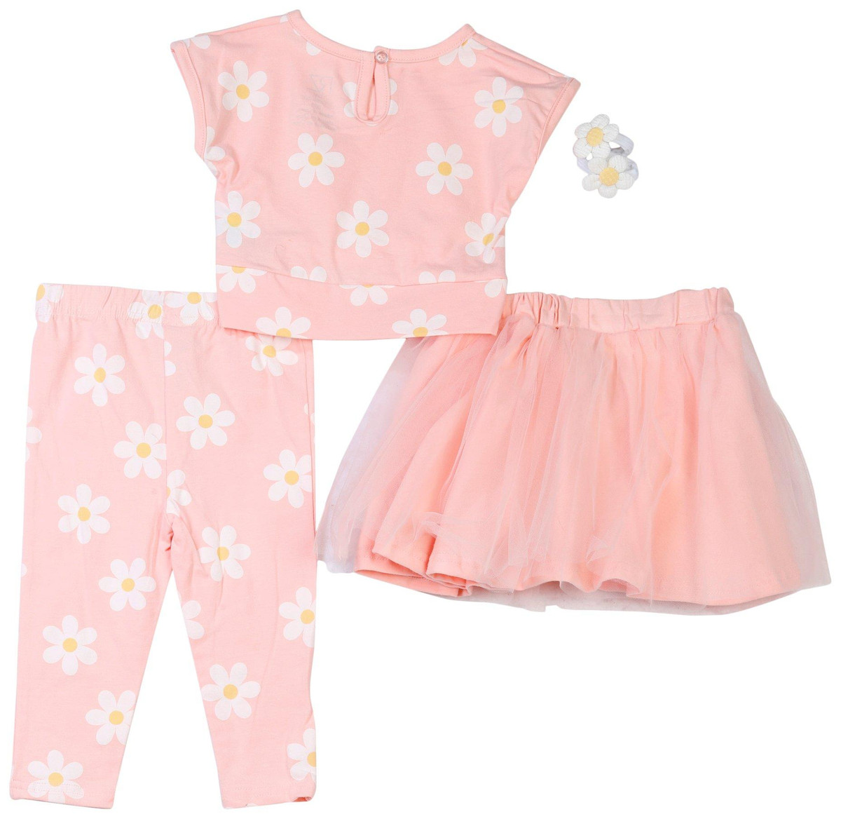 Add playful elegance to her wardrobe with this Baby Girls 4 Piece Daisy Tutu Skirt Set. Featuring a daisy floral pattern, the set includes a short sleeve shirt and matching pants in a soft cotton spandex blend, paired with a pink tutu and coordinating hair tie. Perfect for special occasions or dress-up fun. Machine wash cold for easy care.