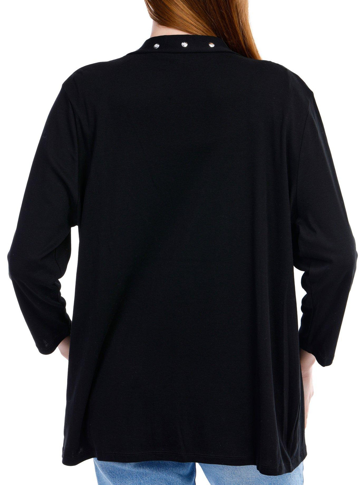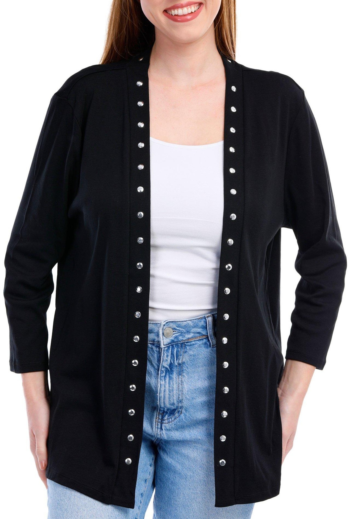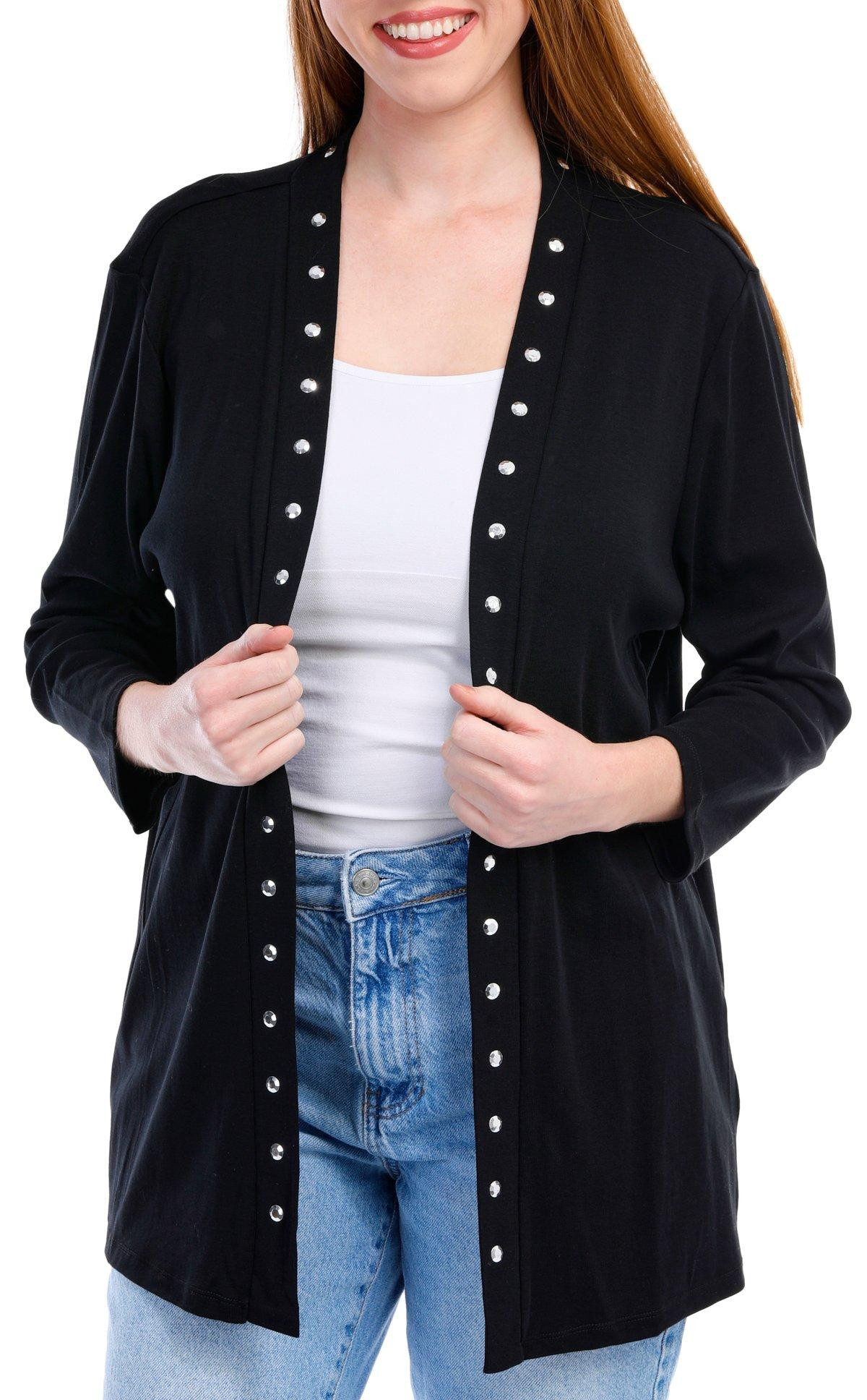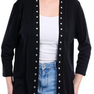 Introducing the Women’s Grommet Cardigan, crafted from a comfortable blend of cotton and polyester. This stylish cardigan features a solid color and an open front design adorned with chic grommet accents. With its long sleeves and a flattering 28-inch length, it’s perfect for layering and adding a touch of elegance to any outfit. Ideal for both casual and formal occasions, this cardigan is a versatile addition to your wardrobe.