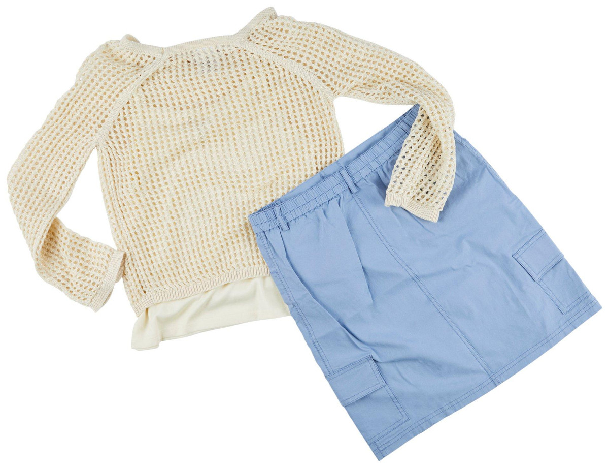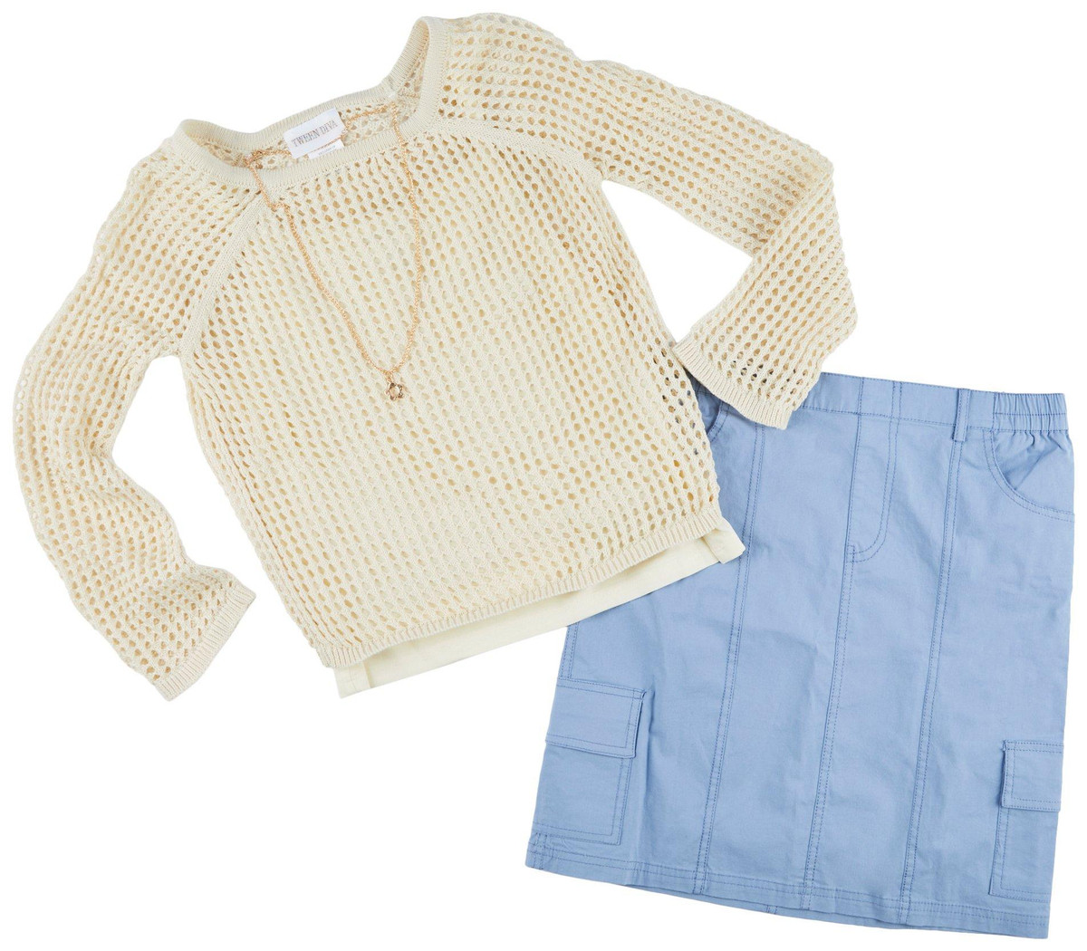 Style meets function with this 3-Piece Cargo Skirt Set for girls. Featuring an open knit top with raglan sleeves and tank lining, a utility-style cargo skirt with an elastic waist and four pockets, plus a matching necklace to complete the look. Comfortable, cute, and ready for any adventure!