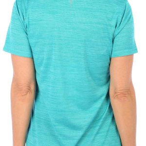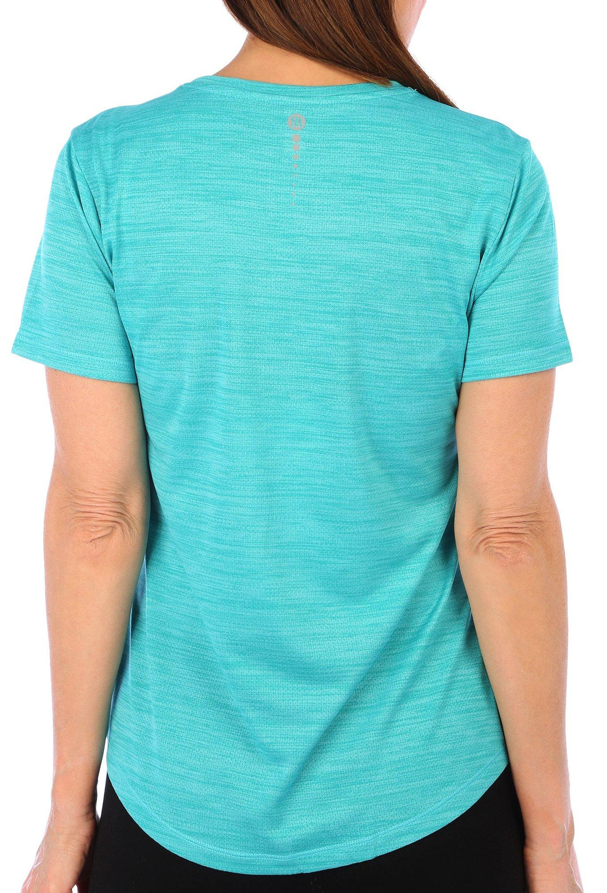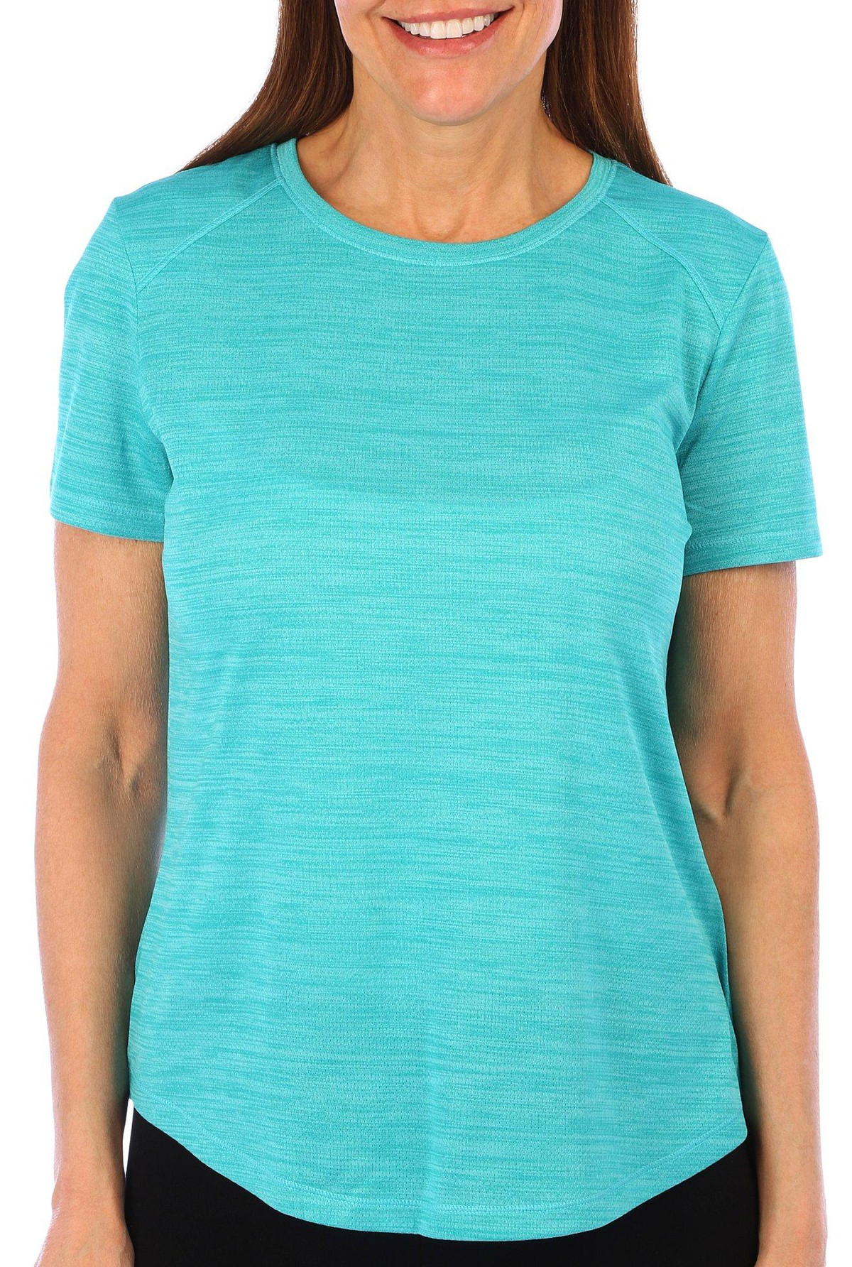 Stay active and stylish with our lightweight, stretchy top. The round neckline and vented short sleeves ensure comfort, while the solid colors complement any outfit. Perfect for workouts or daily wear! The front length measures approximately 25 in. Fabrication 100% polyester.