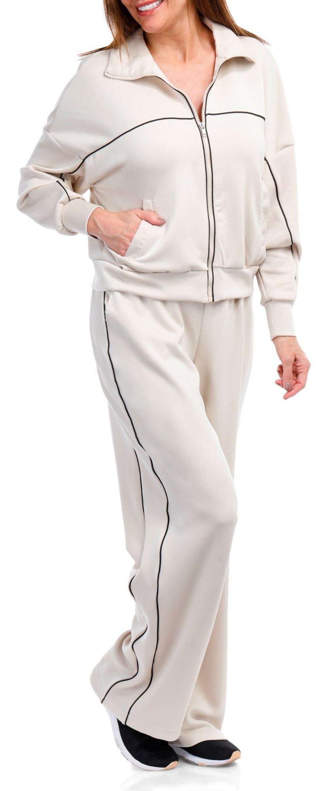 Elevate your activewear with this 2-piece Active Jacket and Sweatpants Set. Crafted from soft scuba fabric, this set offers unparalleled comfort and style. The full-zipped jacket features double front pockets, perfect for keeping essentials close. Matching sweatpants with double front pockets ensure functionality and a sleek look. Fabrication is 45% polyester, 45% rayon, 10% spandex.