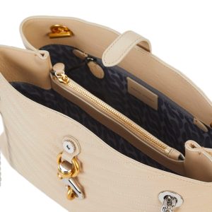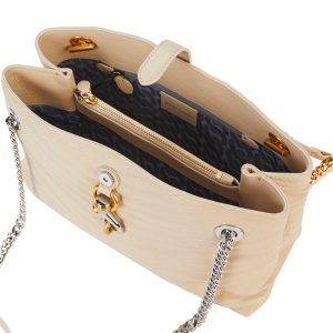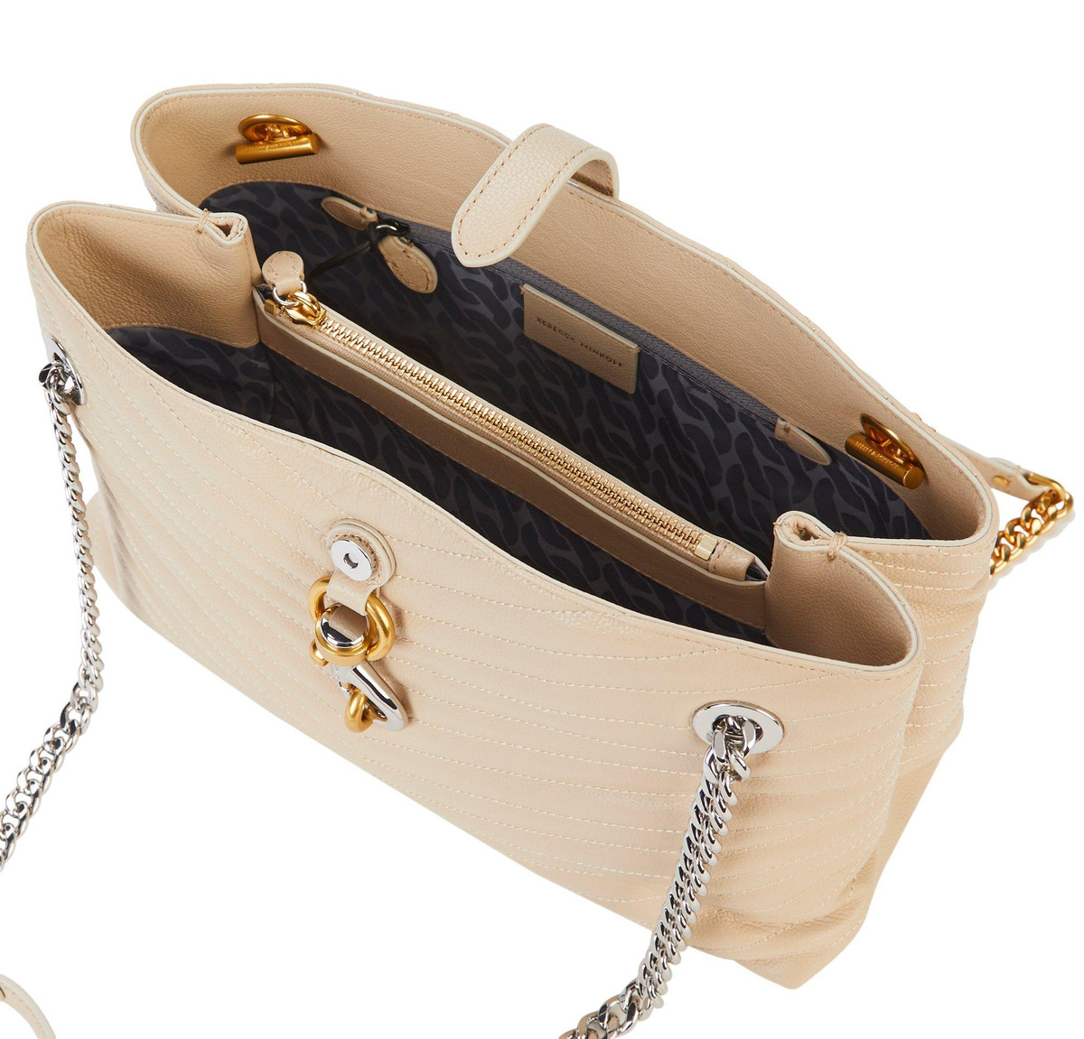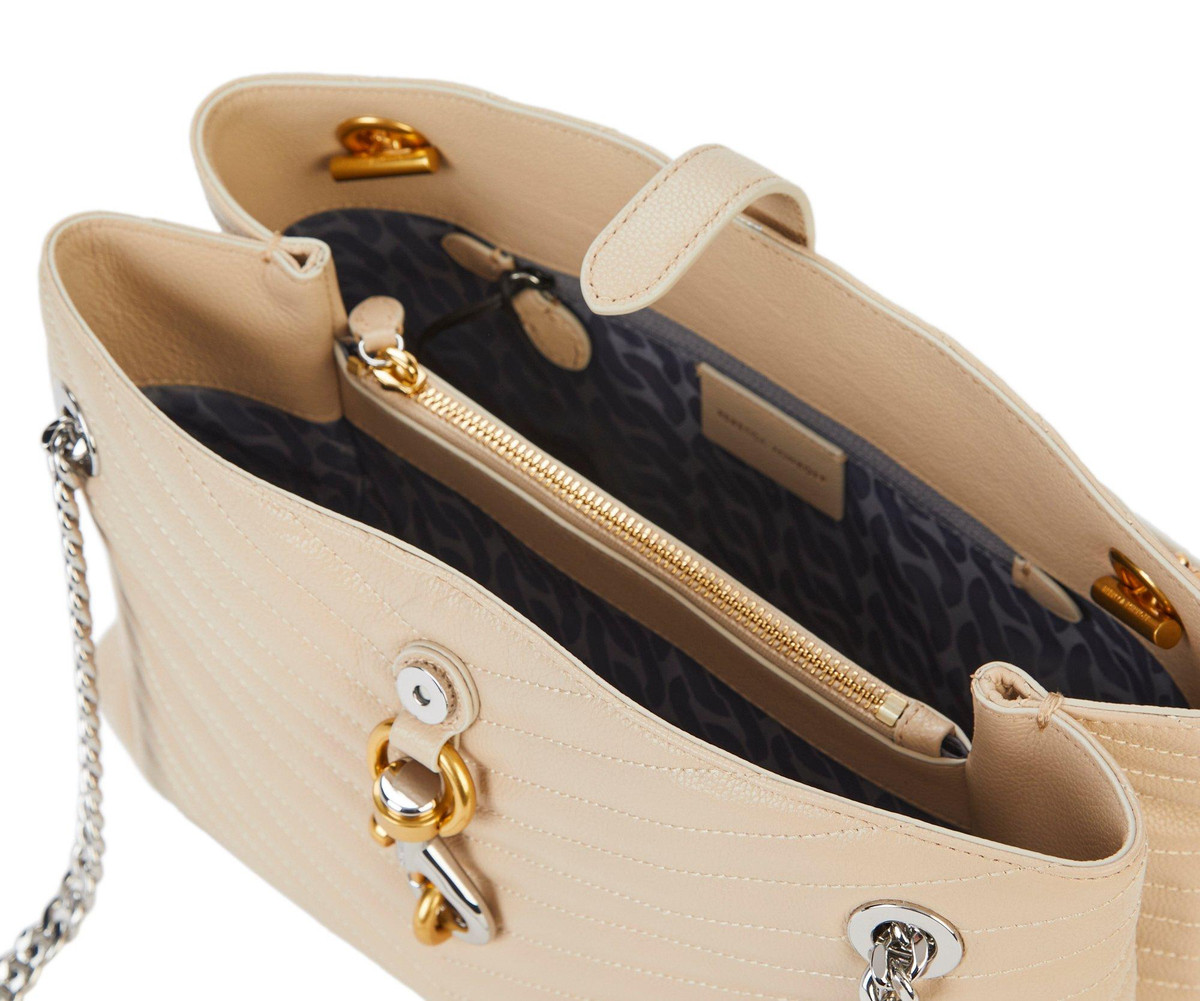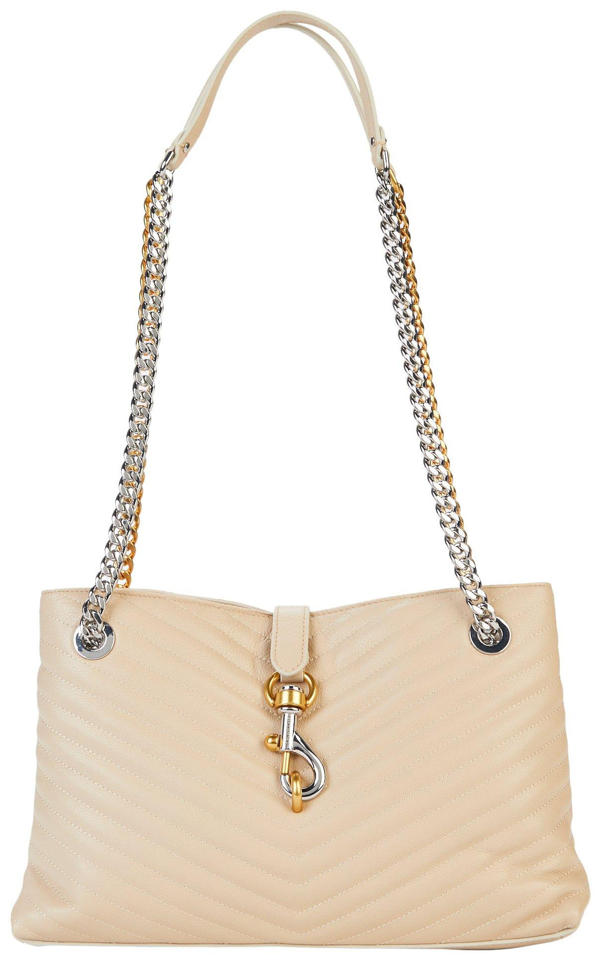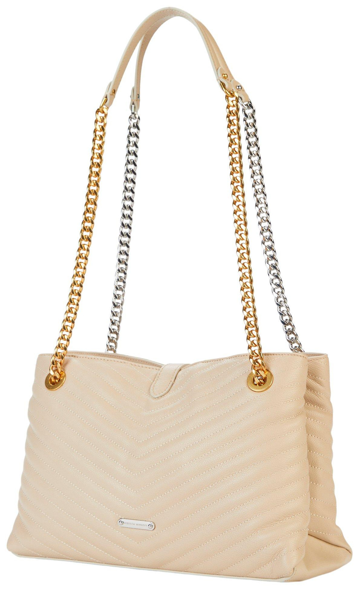 The Edie Shoulder Chain Tote Bag combines elegance and function with a quilted exterior, silver and gold tone hardware, and double chain shoulder straps. Featuring a front snap closure, inner zip pockets, and a triple-compartment design, it is perfect for organized, on-the-go style. Measures 12 in x 5 in x 8 in.