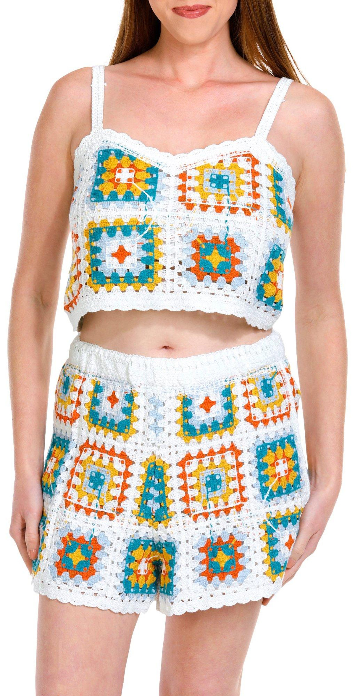 Introducing the Juniors 2 Pc Crochet Crop Top Set, a perfect blend of comfort and style. Made from a mix of cotton and acrylic, this set includes a sleeveless crochet crop top and matching shorts, both featuring a vibrant multicolored design. Ideal for sunny days, this trendy ensemble adds a playful touch to your wardrobe. Elevate your summer look with this chic and eye-catching crochet set!