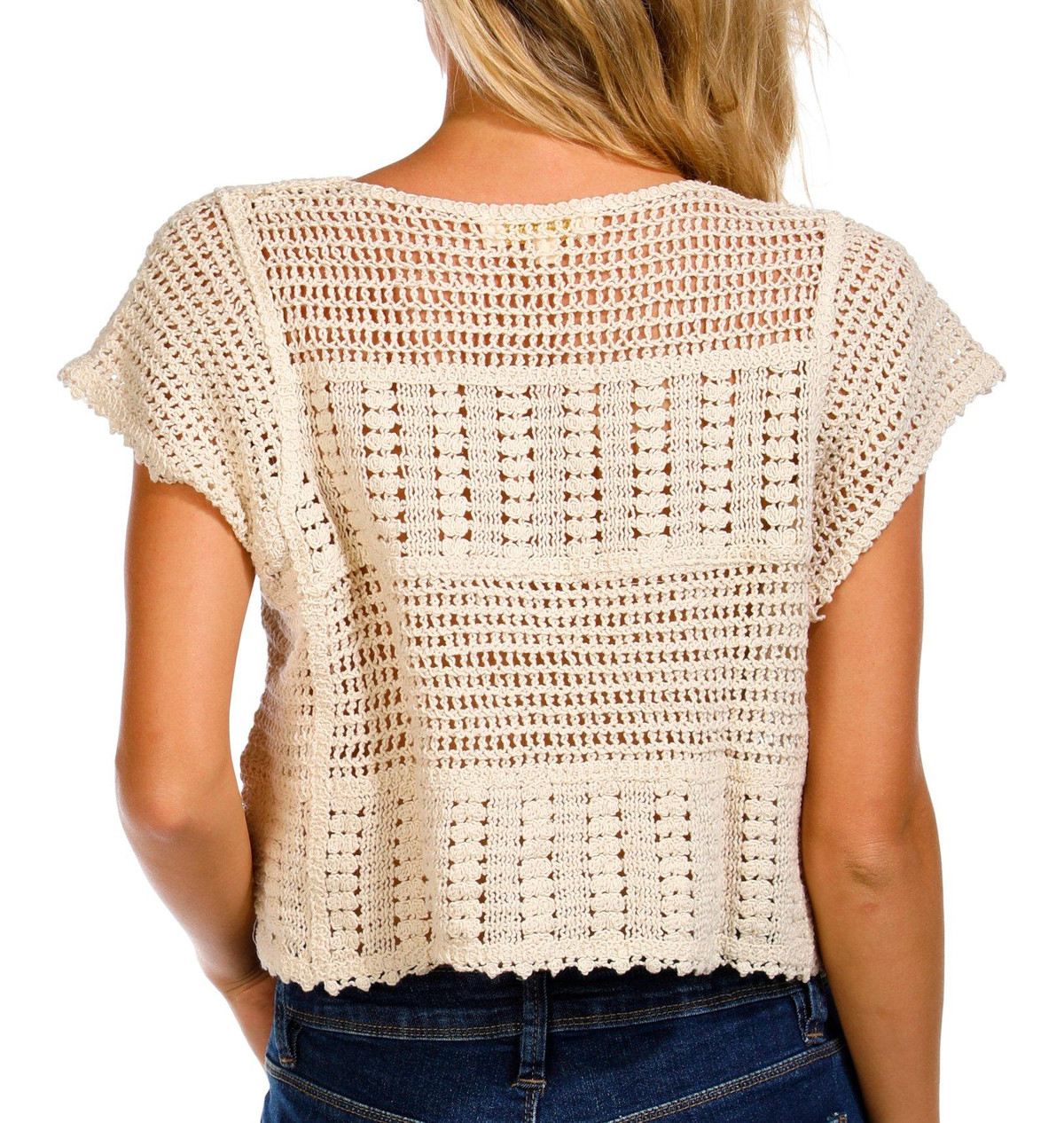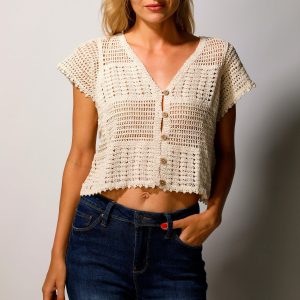 This Juniors Crochet Button Down Top is a charming and versatile piece for any wardrobe. Made from 100% cotton, this top features a stylish solid color, short sleeves, and a button-down front. The cropped length adds a trendy touch, making it perfect for pairing with jeans or skirts. Embrace a casual yet chic look with this delightful crochet top. Fabrication is 100% cotton. Top length measures approximately 16.5 in.