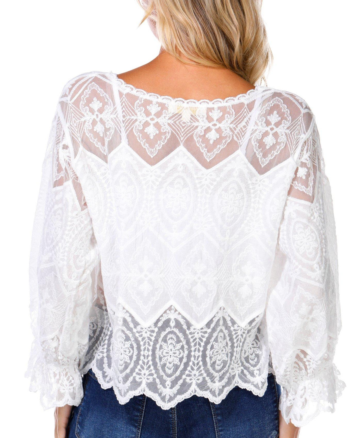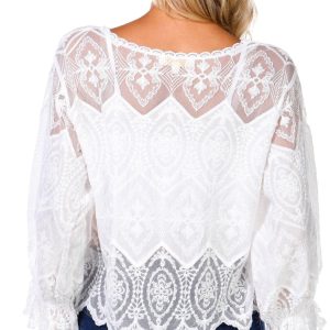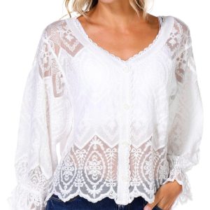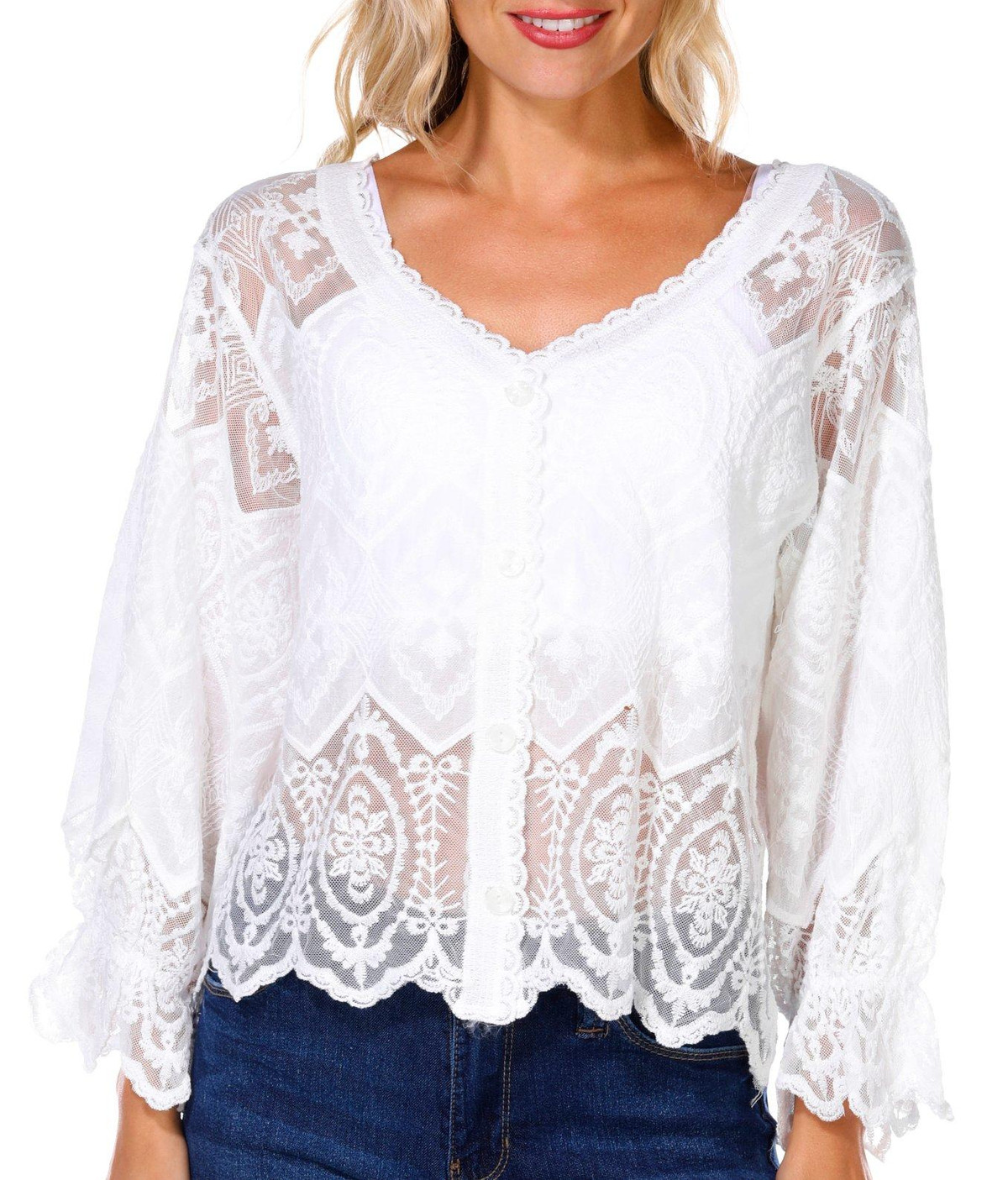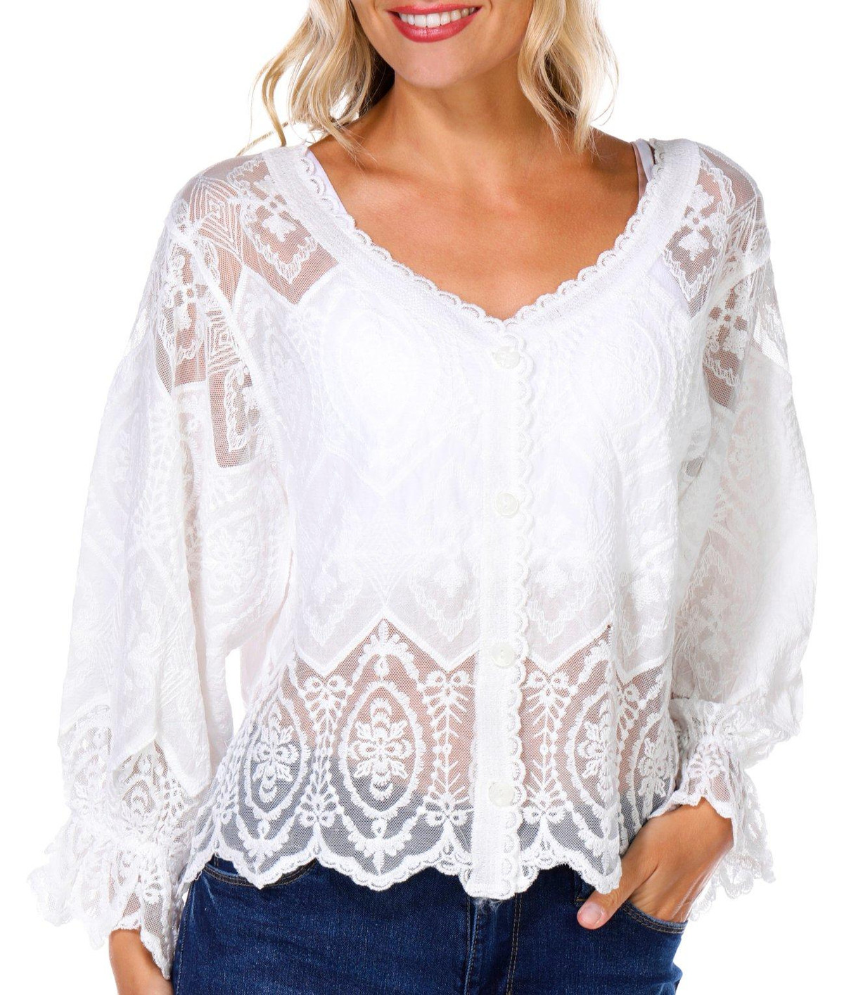 Turn heads in this Juniors Long Sleeve Button Down Lace Mesh Top. Crafted in a solid color with a romantic lace design and airy mesh fabrication, it features a flattering v-neckline and button-down front. The long sleeves add elegance, making it perfect for layering or wearing solo. Fabrication 100% cotton