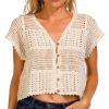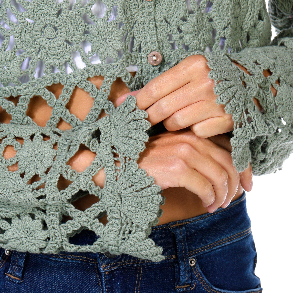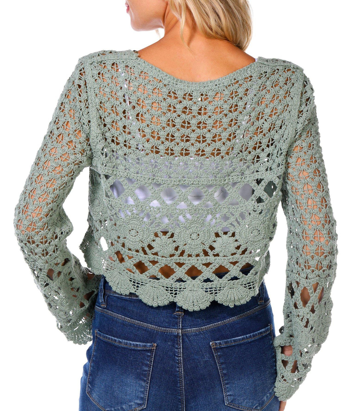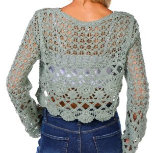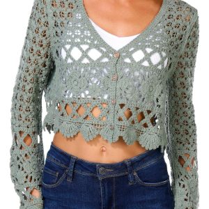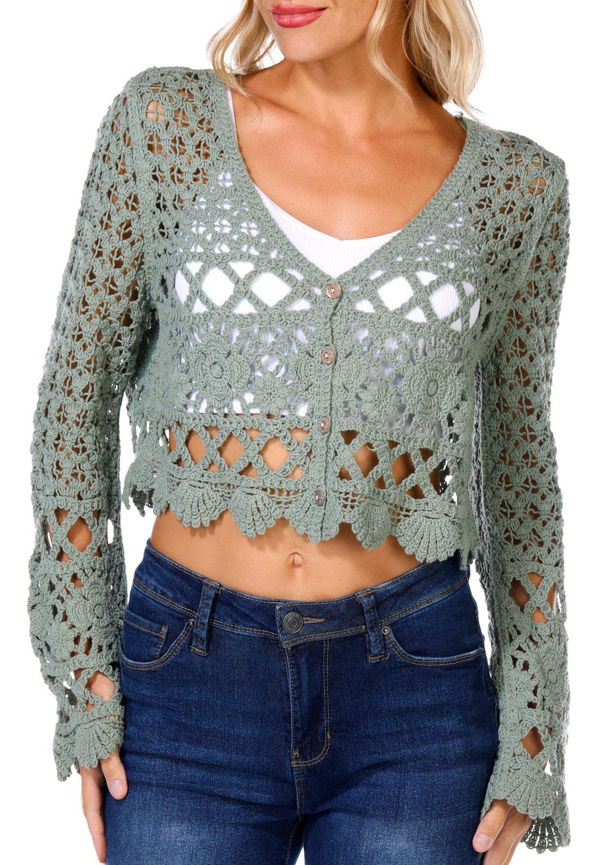 Trendy and textured, the Juniors Long Sleeve Button Front Geo Crochet Top features a cropped silhouette, button-down front, and long sleeves. The geometric crochet design adds a bold, boho-inspired flair that is perfect for layering or wearing solo. Fabrication 100% cotton