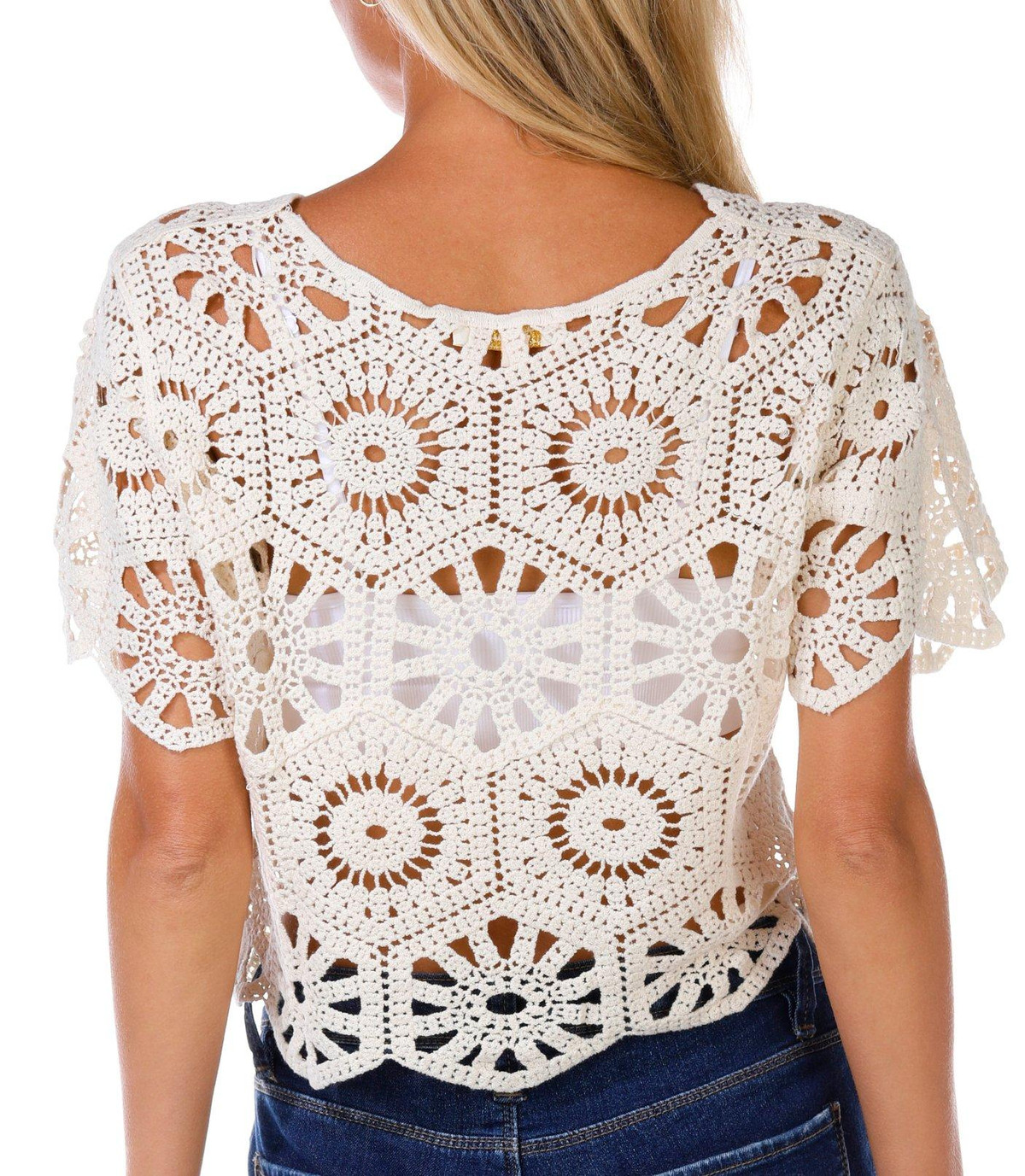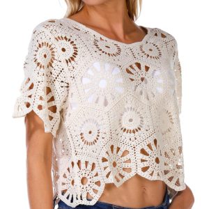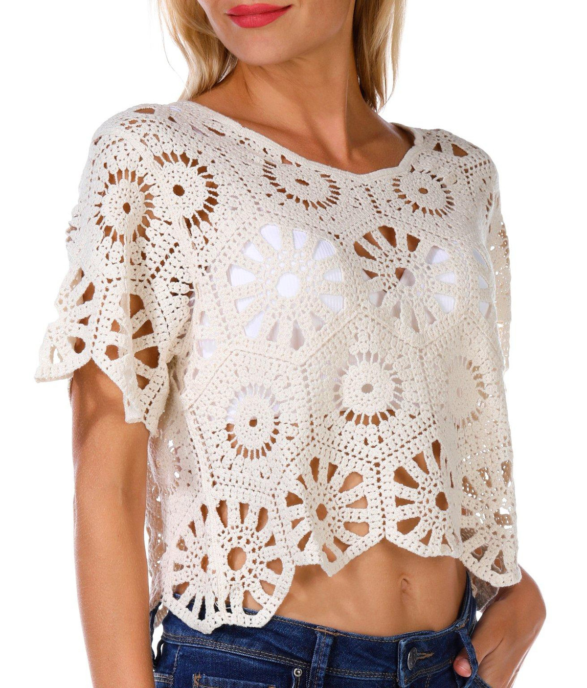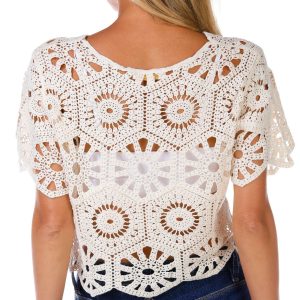 This juniors crop top features a solid color with a stylish crochet exterior. Designed with short sleeves, a crew neckline, and a scalloped hem, it offers a trendy and feminine look that pairs perfectly with high waisted jeans or skirts. Fabrication 100% cotton