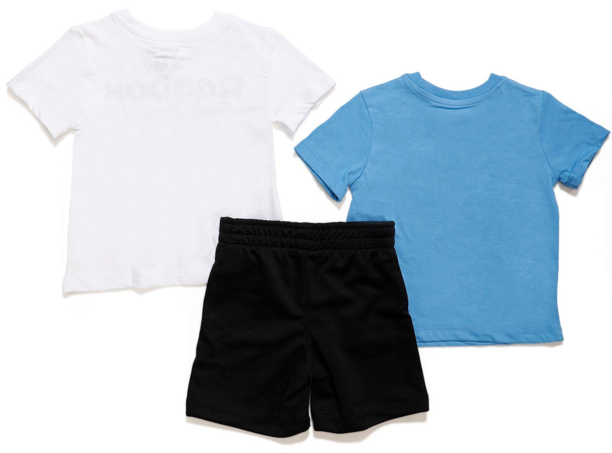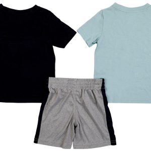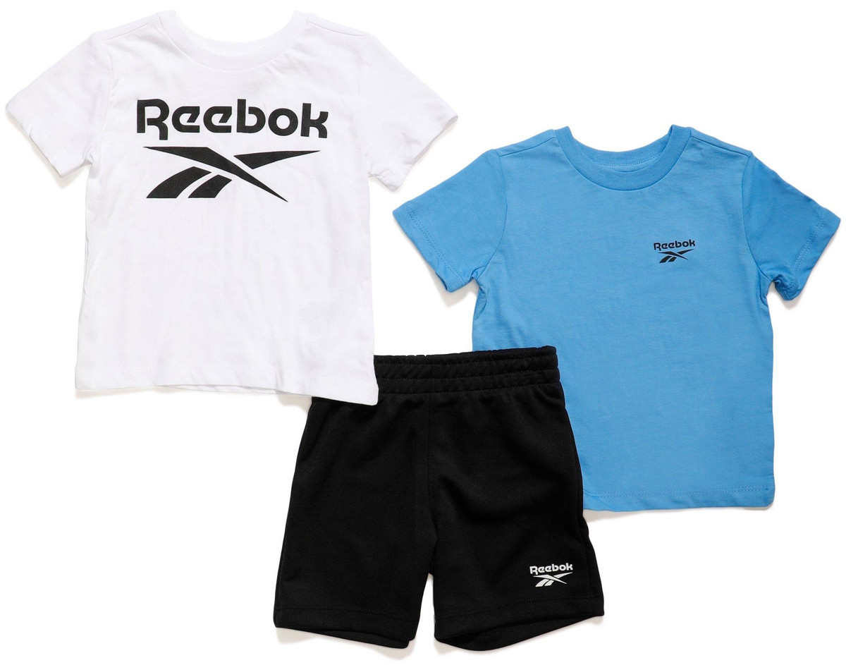 This Reebok 3 piece set features crew neck shirts and coordinating active shorts in a fresh new color. Made with breathable mesh fabric and an elastic waist for all day comfort, this set is ideal for training or lounging with ease and style.