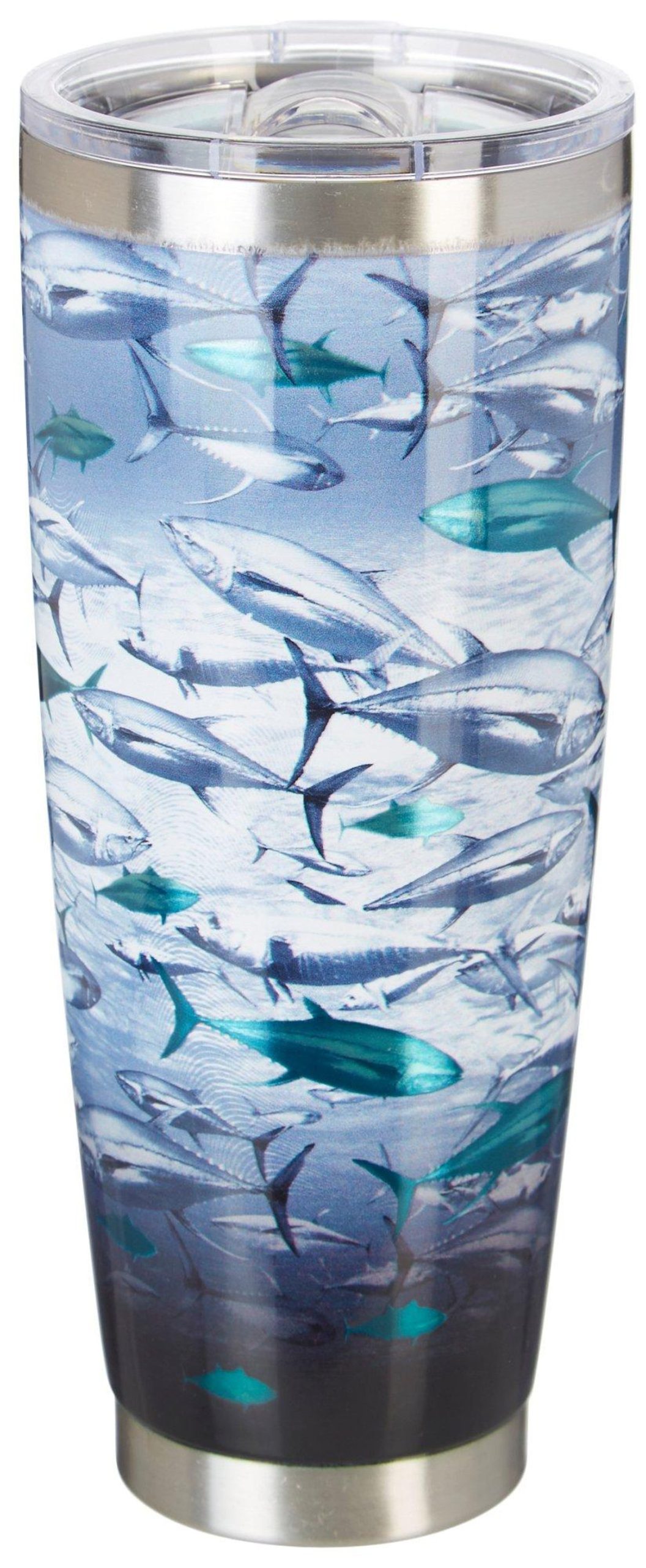 Reel Legends creates high quality & innovative drinkware that makes a creatively special gift. This travel tumbler keeps drinks hot or cold longer, reduces condensation, and features Reel Legends School of Tuna design. Spill-proof lid included. Holds 30 oz.