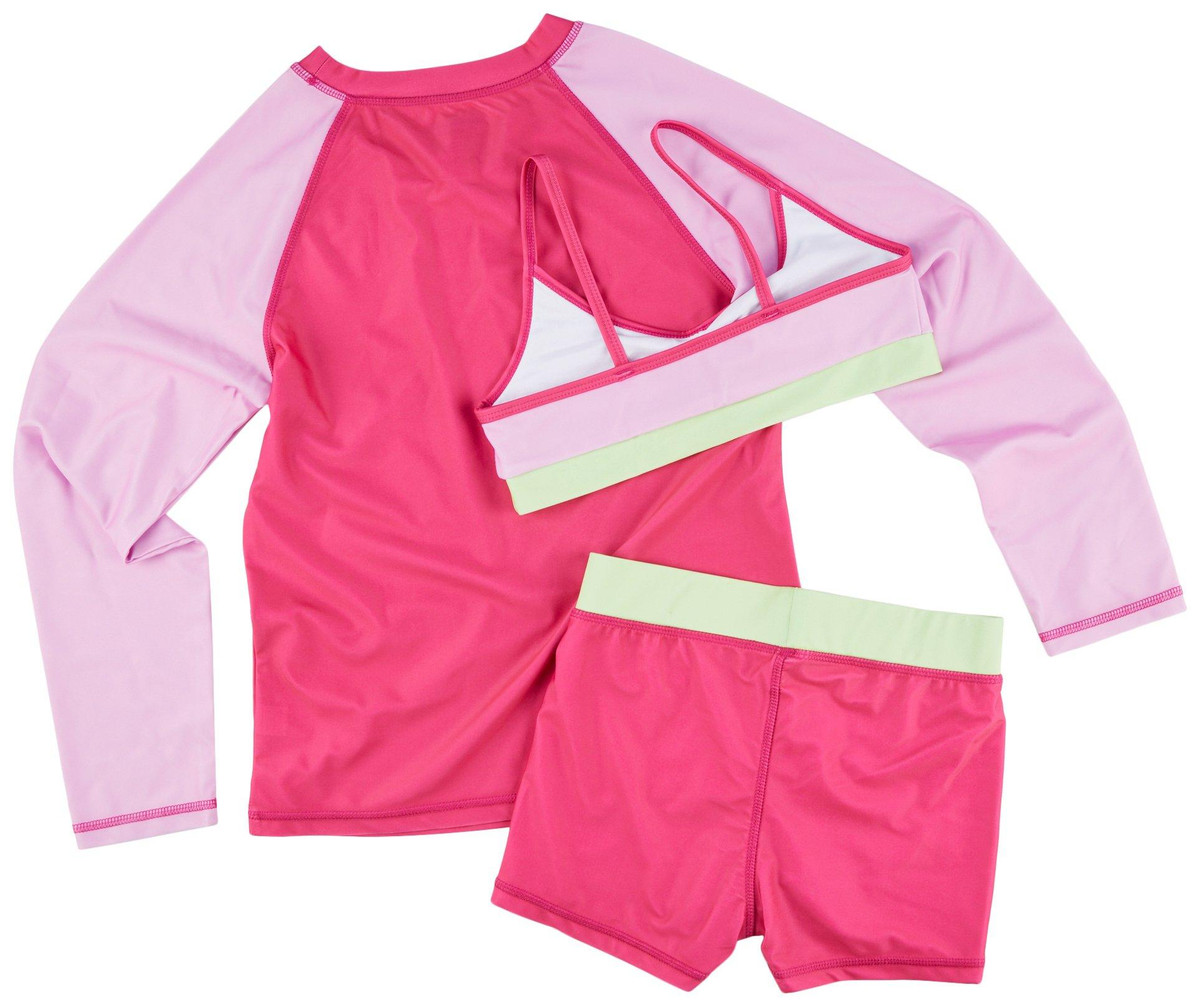 Keep your little ones stylish and protected with this Girls 3-piece Swimsuit Set! This adorable set features fun Colors patternand solid and includes a long sleeve top, Bikini Top and matching shorts, offering excellent sun protection for those long beach days. Fabrication is 85% polyester, 15% spandex.