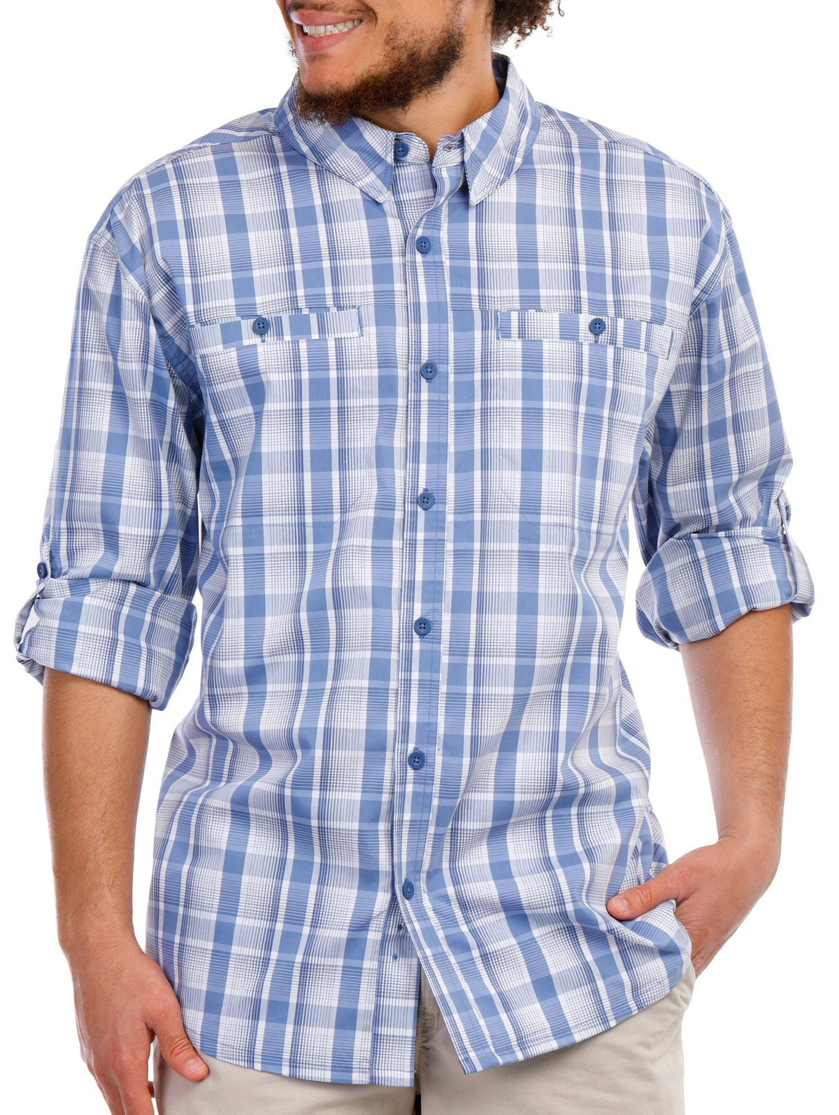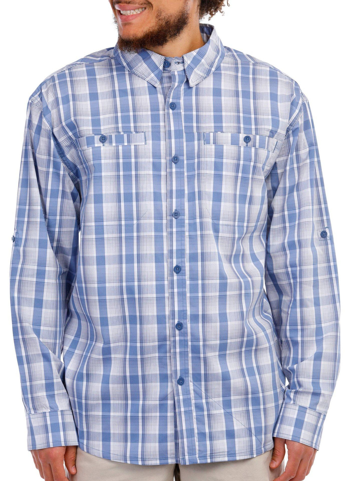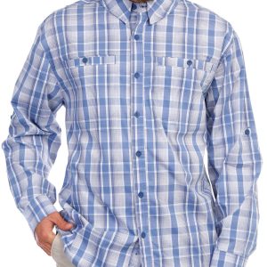 The Men’s Long Sleeve Terrain Button Down Shirt, crafted from a blend of cotton, polyester, and spandex, offers a comfortable and flexible fit. Featuring a stylish plaid print, this shirt is designed with a classic collared neckline, practical chest pockets, and roll tab sleeves for added versatility. Perfect for both casual and semi-formal occasions, this piece adds a touch of rugged elegance to any wardrobe.